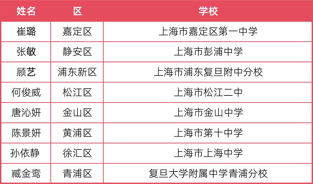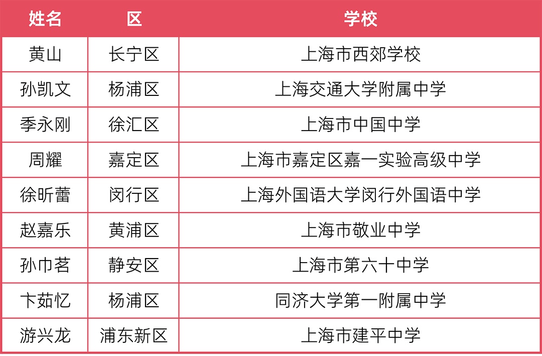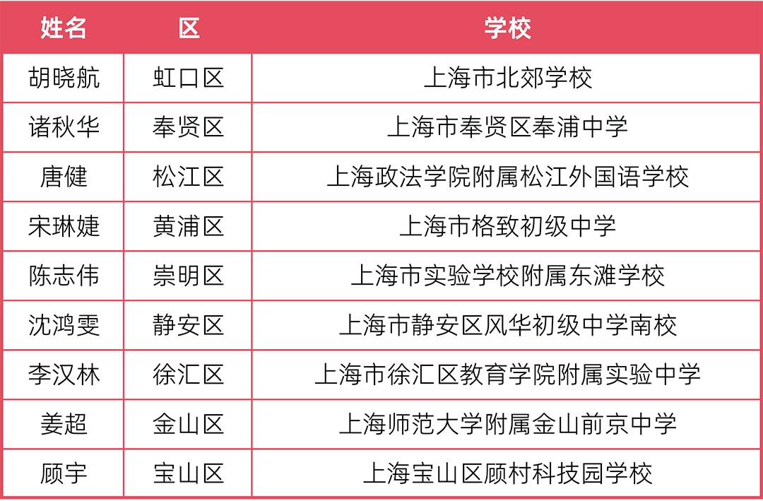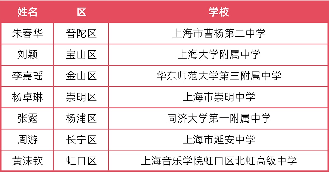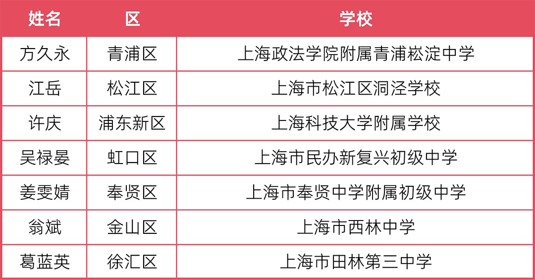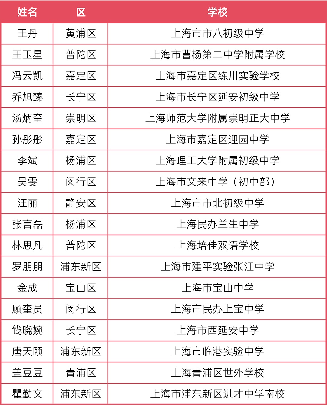 “上海市基础教育中青年教师教学比赛”始于1985年,被誉为上海基础教育界的“奥运会”,各学科每四年轮转一次,对学科教学的影响深远,已成为展示中青年教师教学水平的品牌项目,对提升教师教学能力发挥了直接且显著的作用。2025年教学比赛是第八轮的第四年,参赛学科(学段)包括小学英语、初中英语、高中英语、小学体育与健康、初中体育与健康、高中体育与健康、幼儿教育7个学科/学段。 2025年上海市基础教育(幼儿园)中青年教师教学比赛 获 奖 名 单 小学英语 一等奖 9人 二等奖 21人 (以姓氏笔画为序) 三等奖 7人 (以姓氏笔画为序) 初中英语 一等奖 9人 二等奖 20人 (以姓氏笔画为序) 三等奖 7人 (以姓氏笔画为序) 高中英语 一等奖 8人 二等奖 18人 (以姓氏笔画为序) 三等奖 7人 (以姓氏笔画为序) 小学体育与健康 一等奖 9人 二等奖 18人 (以姓氏笔画为序) 三等奖 7人 (以姓氏笔画为序) 初中体育与健康 一等奖 9人 二等奖 18人 (以姓氏笔画为序) 三等奖 7人 (以姓氏笔画为序) 高中体育与健康 一等奖 9人 二等奖 18人 (以姓氏笔画为序) 三等奖 7人 (以姓氏笔画为序) 幼儿教育 一等奖 22人 二等奖 45人 (以姓氏笔画为序) 三等奖 18人 (以姓氏笔画为序) 如对公示结果有异议,请于2025年12月2日(星期二)至12月8日(星期一)期间,以书面形式向工作组提出,并署真实姓名。 联系地址:上海市静安区陕西北路500号2607室; 邮编:200041; 传真:(021-)62179565。
