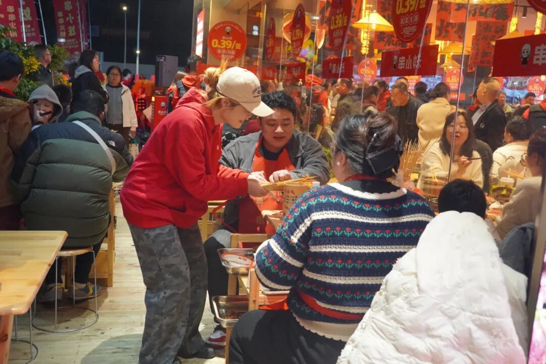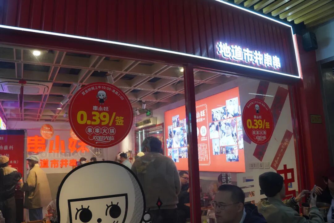 傍晚时分,店里坐得满满当当,过道也支起小桌。玻璃上贴着醒目的“0.39元/串”,大学生们熟络地跟王林打招呼:“三哥,又来巡店啦!”