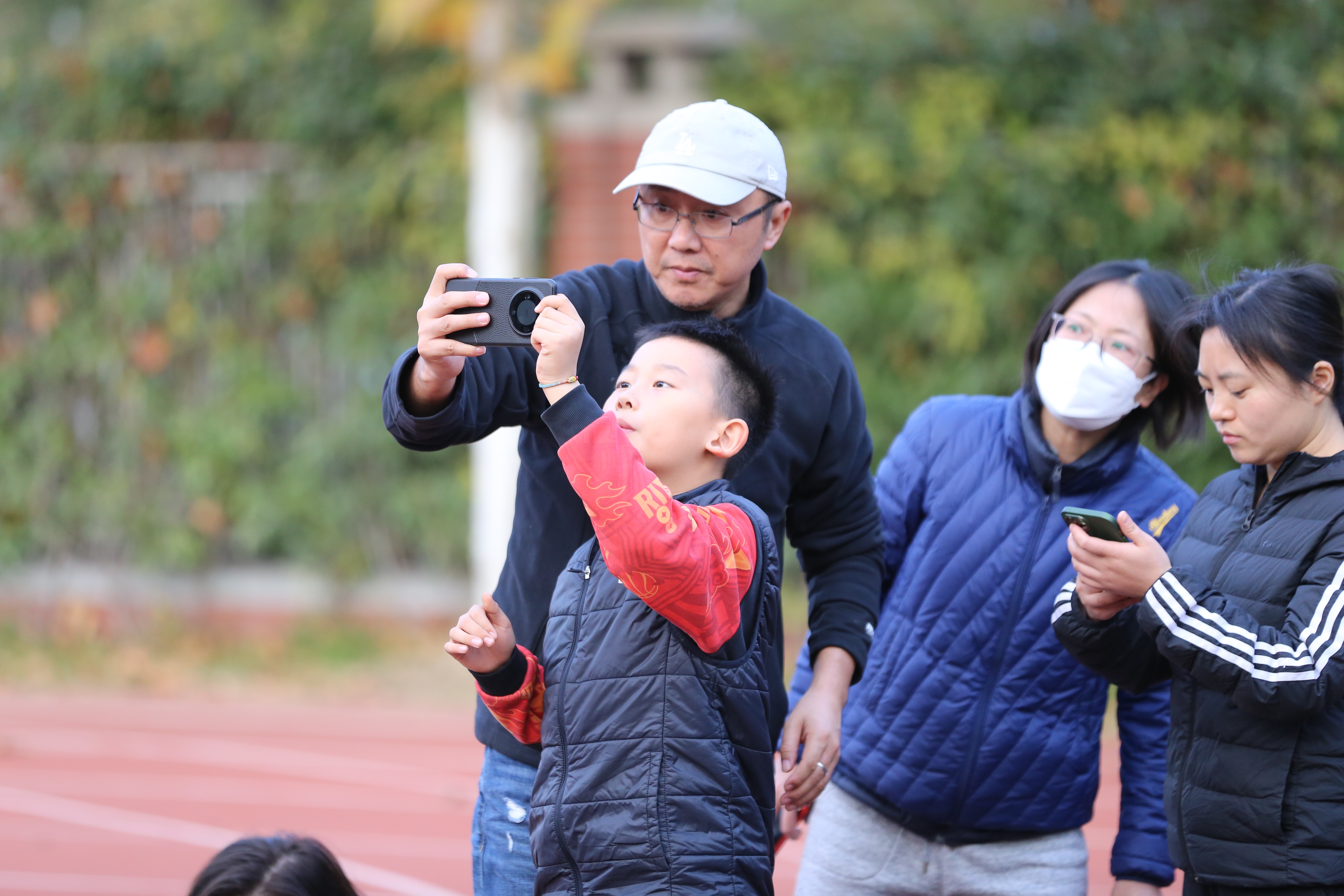 “实战”开启后,30组亲子家庭被分成自然组、人文组、视频组,在专业摄影师和技术人员的带领下,前往指定拍摄点小试牛刀。自然组的成员们聚焦花草绿植,捕捉叶片间的光影流转;人文组穿梭于校园建筑间,用镜头定格师生互动的温情瞬间;视频组则以动态视频记录学校之美。期间,家长与孩子或蹲或站、共同探讨,摄影师们耐心指导,手把手教授参数调整、构图优化技巧等。