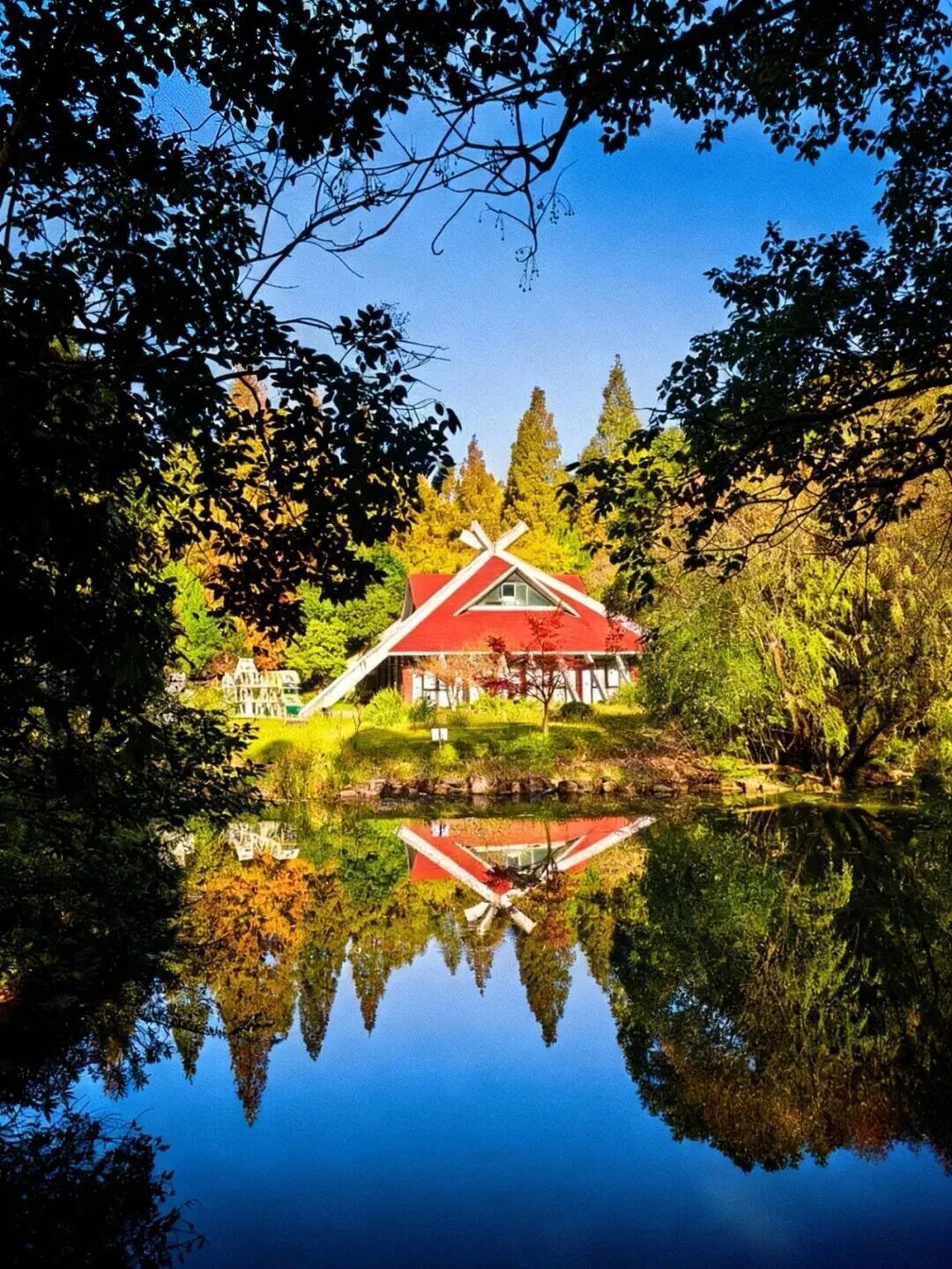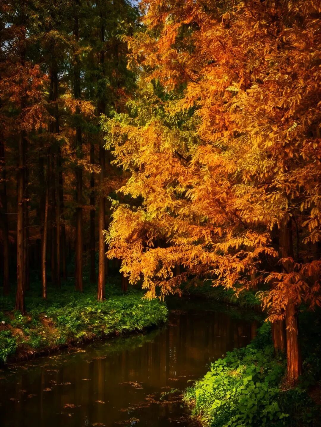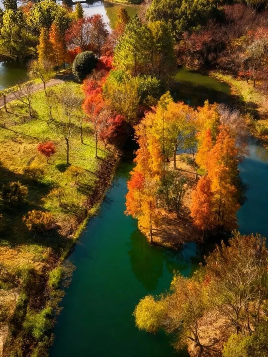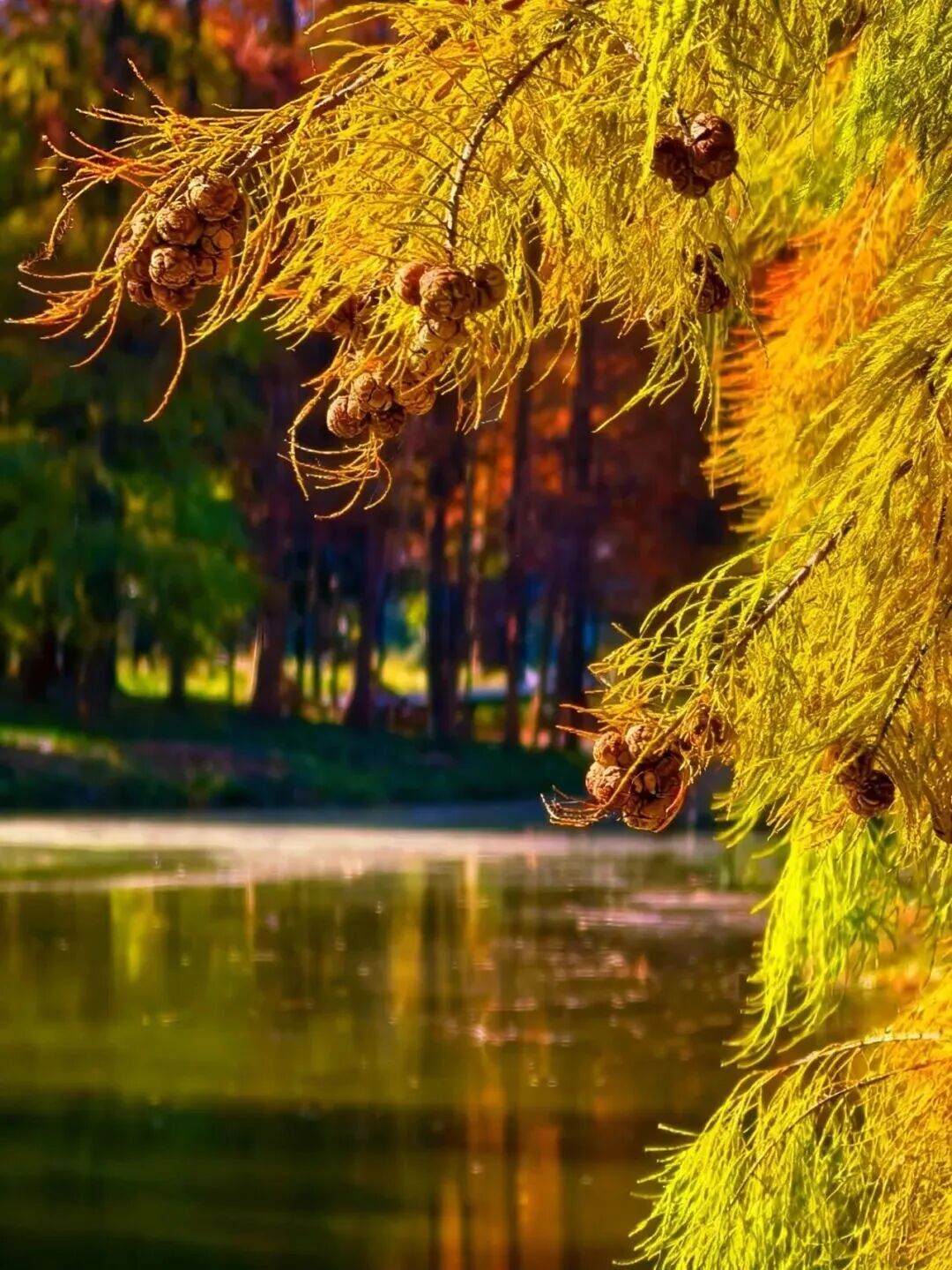 赏景正当时。11月下旬至12月上旬,这里迎来了最佳观赏期——水杉似火、银杏如金、红枫燃情,深红、明黄与墨绿交织成油画,湖面映着斑斓树影,随手拍都是冬日大片。