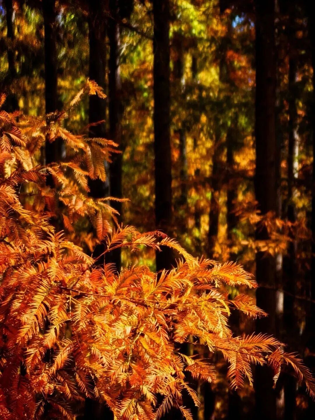 阳光穿透林间,洒下斑驳光影,松针的清冽混着草木香漫在空气里。满林尽染,像打翻了暖调调色盘,为冬日添了鲜活暖意。