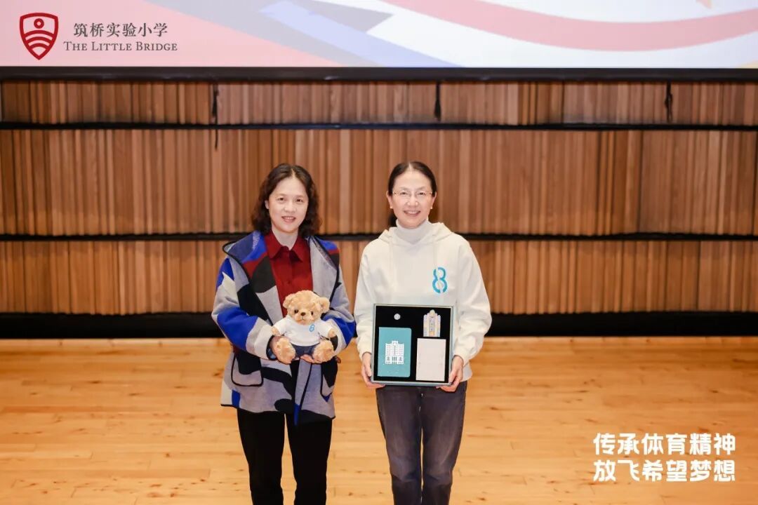 上海浦东新区民办筑桥实验小学党支部书记、副校长与上海市体育宣传教育中心负责人互赠纪念品