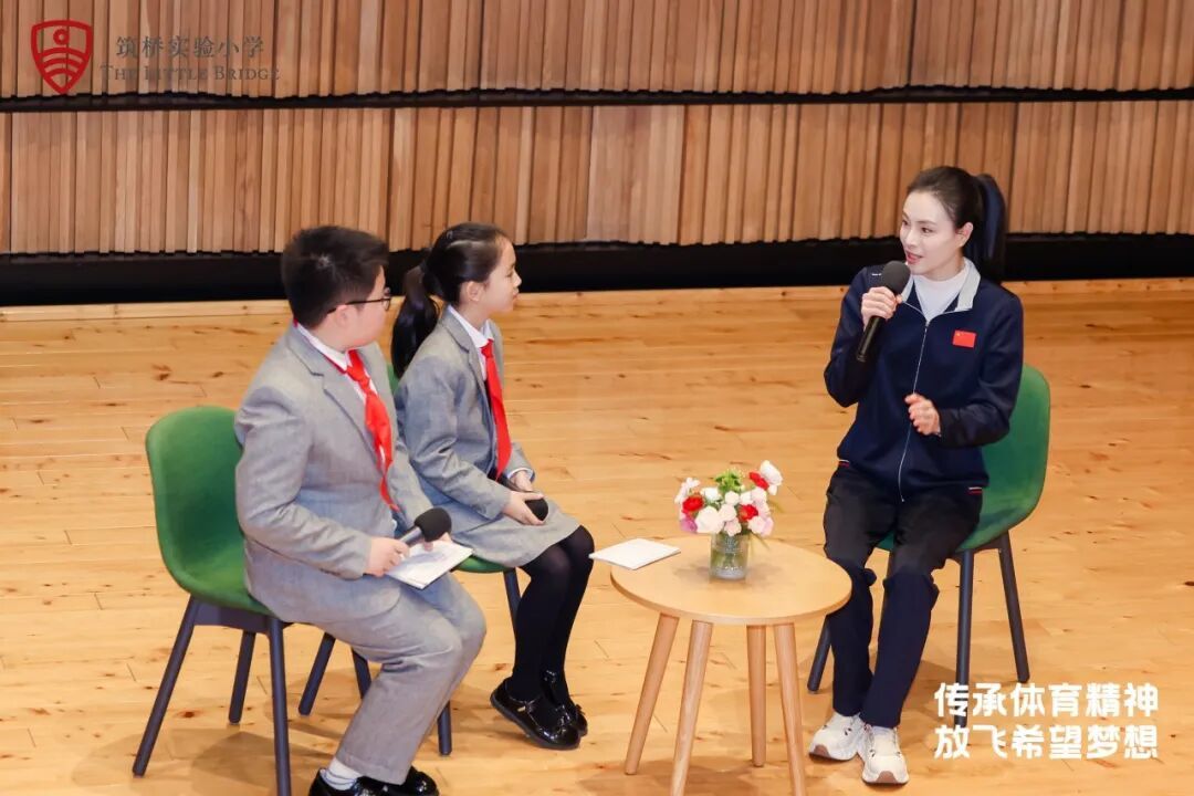 本次收官站特邀跳水奥运冠军吴敏霞与筑桥师生面对面交流,吴敏霞通过一段短片分享了她的奥运记忆,回顾了赛前的紧张情绪、心态调整以及体育赋予她的力量与信念。她通过自身的经历,向在场的学生传递了一份深刻的启示:体育不仅仅是竞技场上的拼搏,更是一场对自我极限的不断突破与挑战。她鼓励同学们勇敢追梦,在成长道路上不畏困难,老师与教练始终会是大家的坚强后盾。