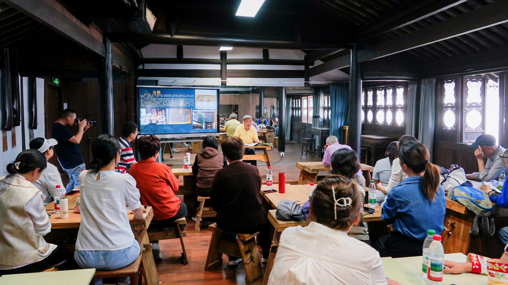 葆素堂带出的故事,让尹明华意识到仓城藏着太多值得挖掘的细节,他不仅想留住这些故事,更想将它们传递出去。去年四月,闵行作家协会成员来到松江,听尹明华讲述仓城往事,深深着迷,随即邀请尹明华前往七宝授课。六月,尹明华走进七宝社区学校,将松江文化娓娓道来,反响热烈。不少听众意犹未尽,想实地探访仓城。于是同年十二月,他带着大家来到云间第一桥——也称跨塘桥上,又带出了明末名士陈子龙与才女柳如是的浪漫传说,据传,他们曾在这里一眼定情。而后,陈子龙经常作诗将柳如是比作西施,足见他对柳如是的深情。
