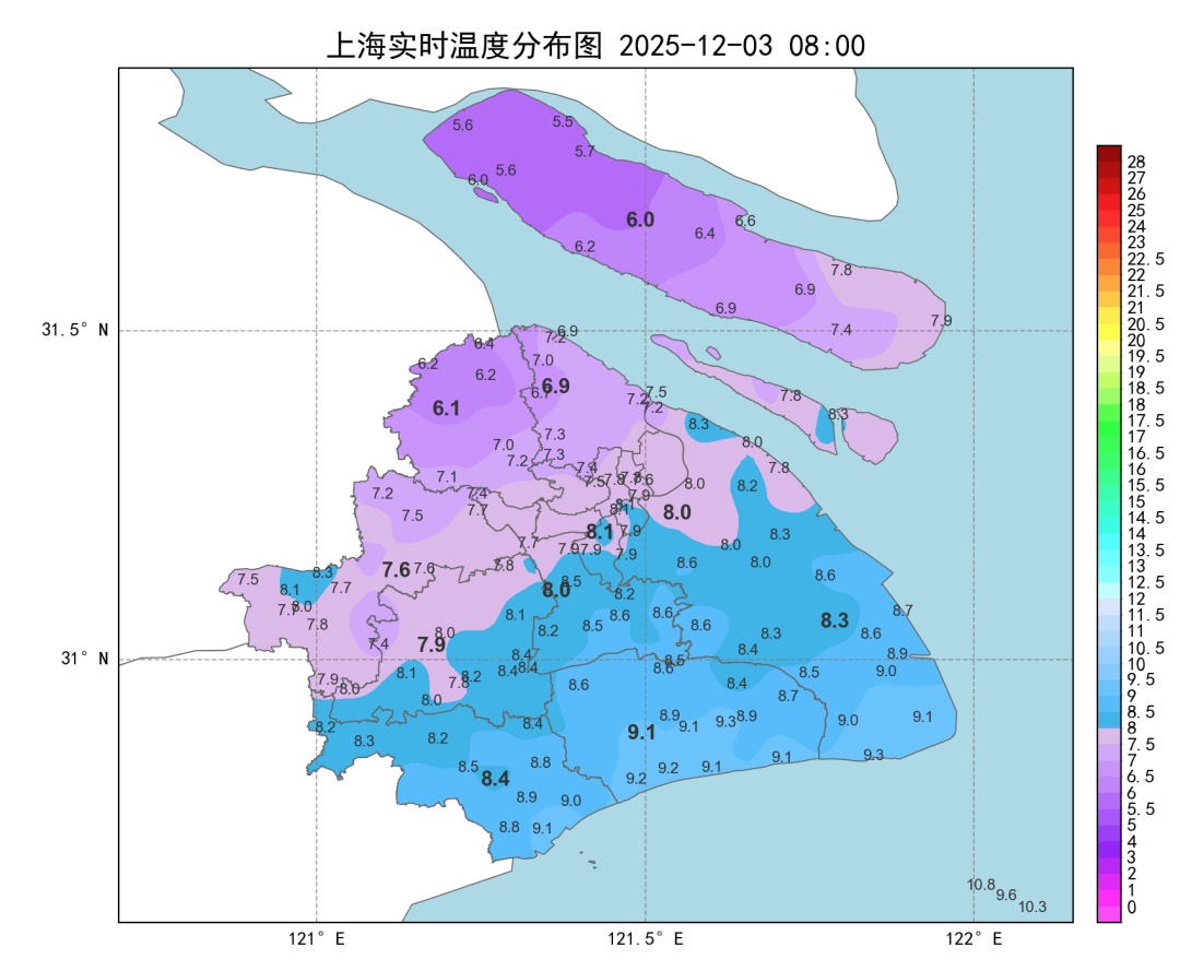 白天上海为晴到多云天气。早间出门时体感明显变冷,8时大部分地区气温在6~9℃之间。白天升温乏力,最高气温也仅10℃左右。风寒效应明显,晚归气温更低、体感更冷,大家外出要穿暖些。天气干燥,今天相对湿度75%~25%,气象火险等级高,请注意用火安全。