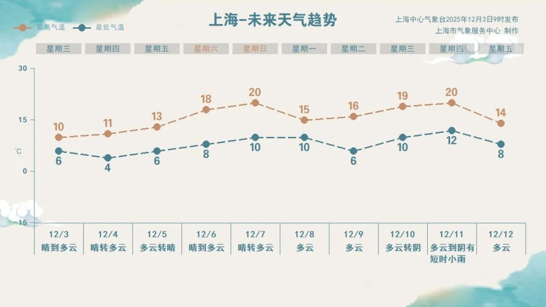此次寒潮过程气温最低点出现在明天早晨,市区最低气温4℃左右,郊区零下2℃到1℃,有薄冰。白天冷气团控制下,升温不明显,最高气温在11℃。周五白天起冷空气的影响基本结束,气温小幅回升。双休日回暖明显,最高气温接近20℃。本周冷暖起伏明显,注意适时调整着装。下周还有一次冷暖交替过程,周初冷空气实力不强。下周中期受暖湿气流北抬影响,云系增多,可能伴有弱降水,稍稍缓和秋燥天气。