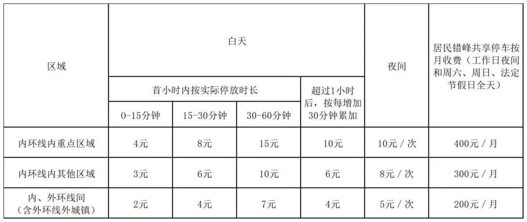 根据市价格主管部门会同市财政部门核定的本市智慧道路停车场收费标准和计费规定(如下表),本次新增的1处内环线内重点区域,4处内、外环线间的收费标准和计费规定执行如下: