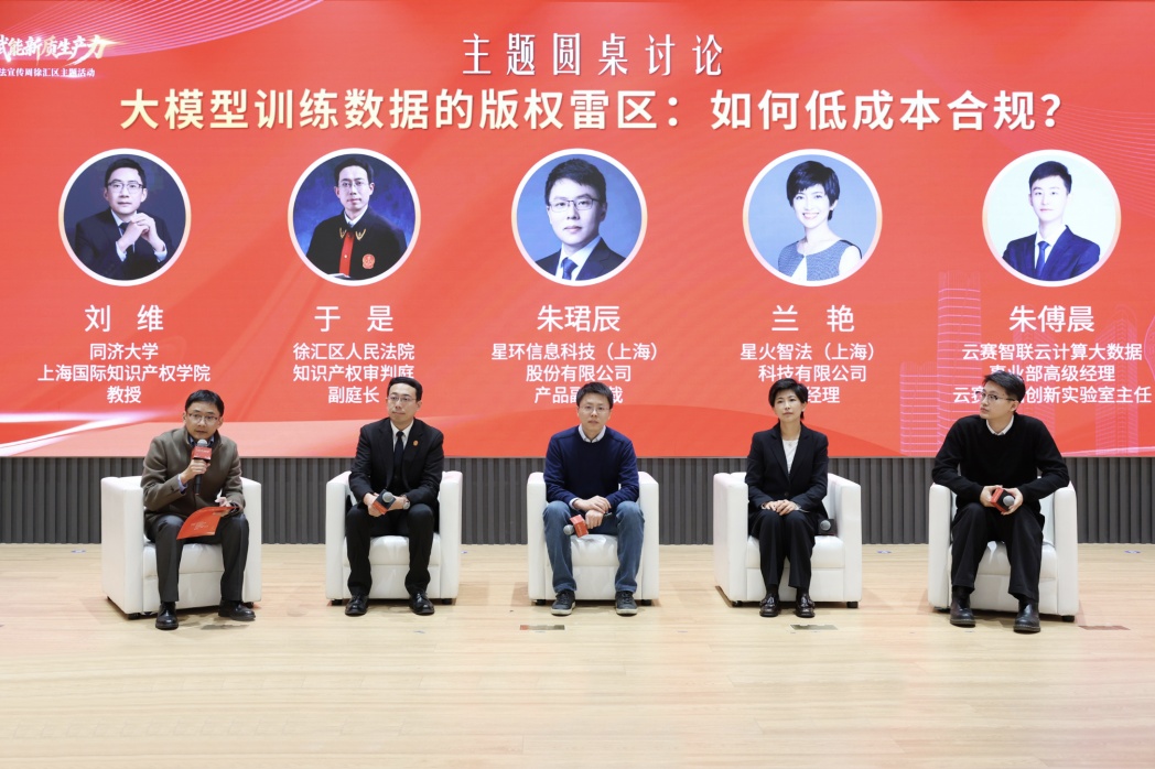 下半场圆桌论坛由同济大学教授刘维主持,围绕 “大模型训练数据的版权雷区:如何低成本合规?” 展开深入探讨。区人民法院知识产权审判庭相关负责人与星环信息科技、星火智法、云赛智联企业代表,从司法实践、公共数据引入、合理使用边界等角度,共商合规路径与创新解决方案。