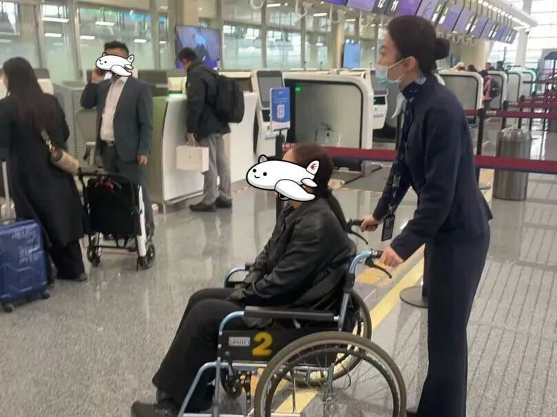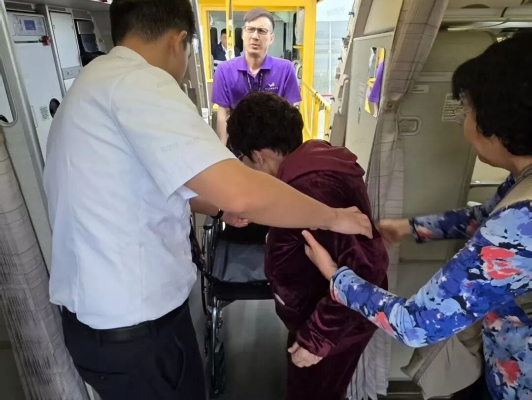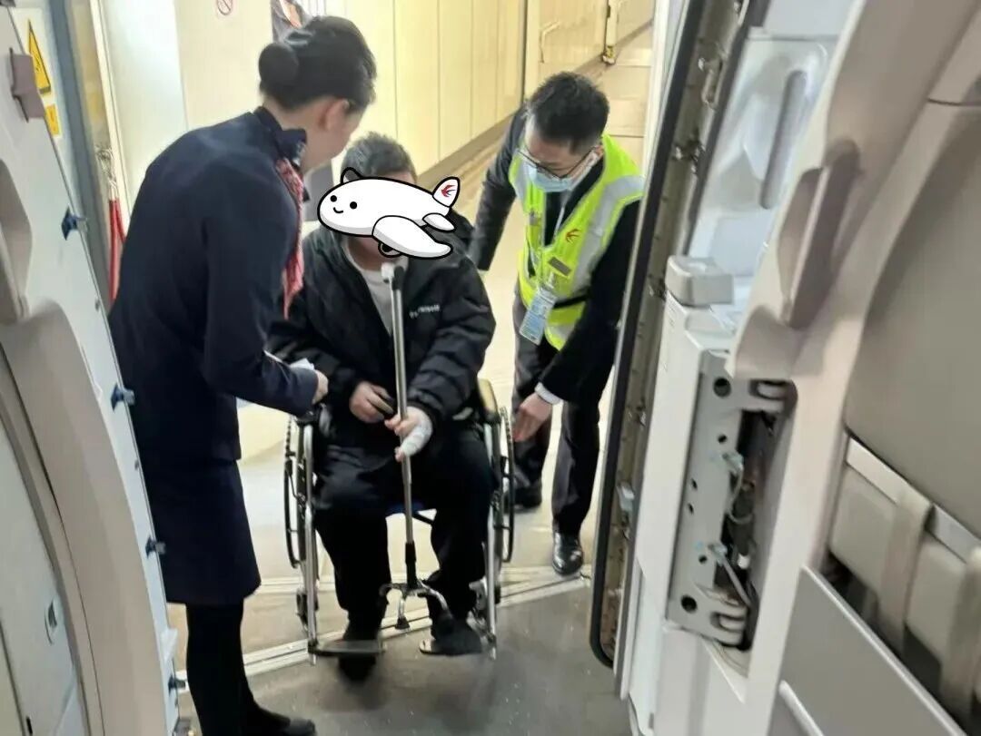 机组人员半蹲着,小心扶着坐在轮椅上的乘客,有人留意着他的状态,有人轻手轻脚地帮着整理背包——没有慌乱,只有稳妥又耐心的协作。