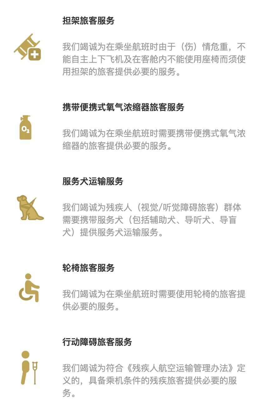 2、机上专项服务可移动式通道扶手、助残设备舱内存放、客舱轮椅、残疾人专用卫生间、机上协助。