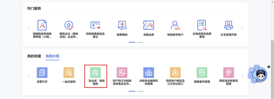 或者直接在登录门户后选择【场景办税】-“走出去”税收服务。