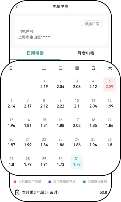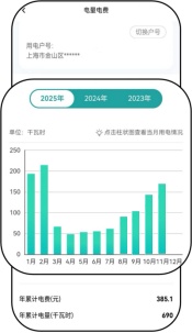 而在“日用电量”视图中,用电日历会直观展示每日用电数据,用电异常增多一目了然;而“月度电费”模块,支持查询近三年每月用电量及费用记录。