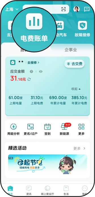 打开“网上国网”App首页,点击“电费账单”可查看电费账单,页面显示本月总用电量。平谷用电、阶梯电量一目了然。