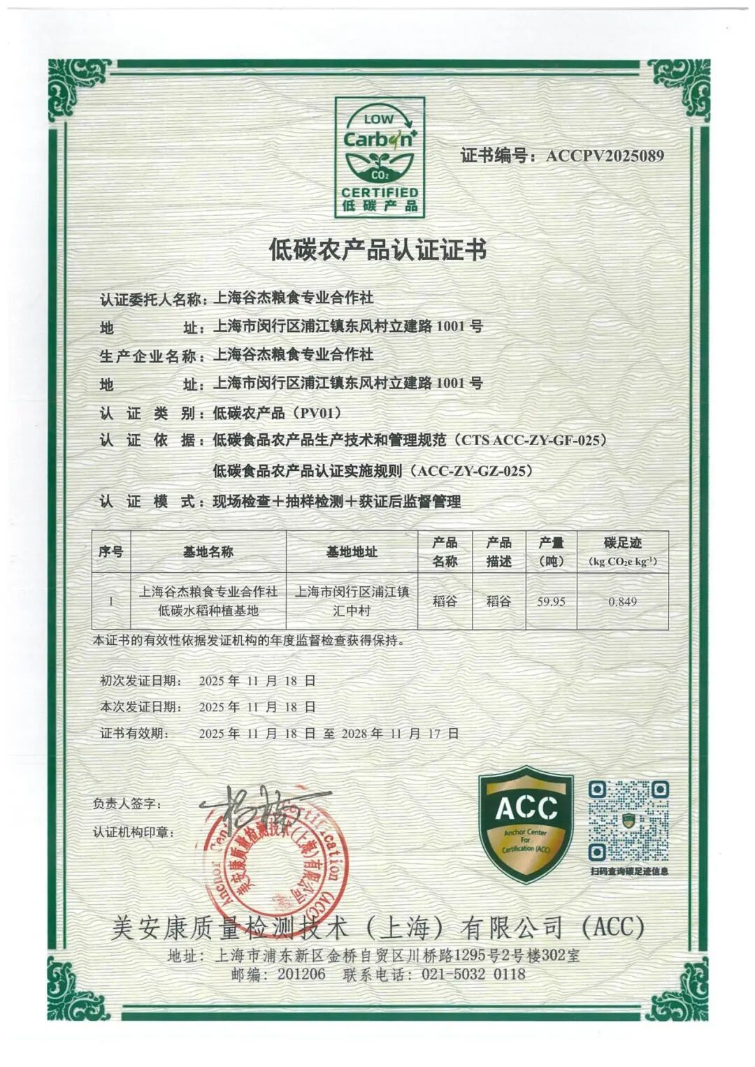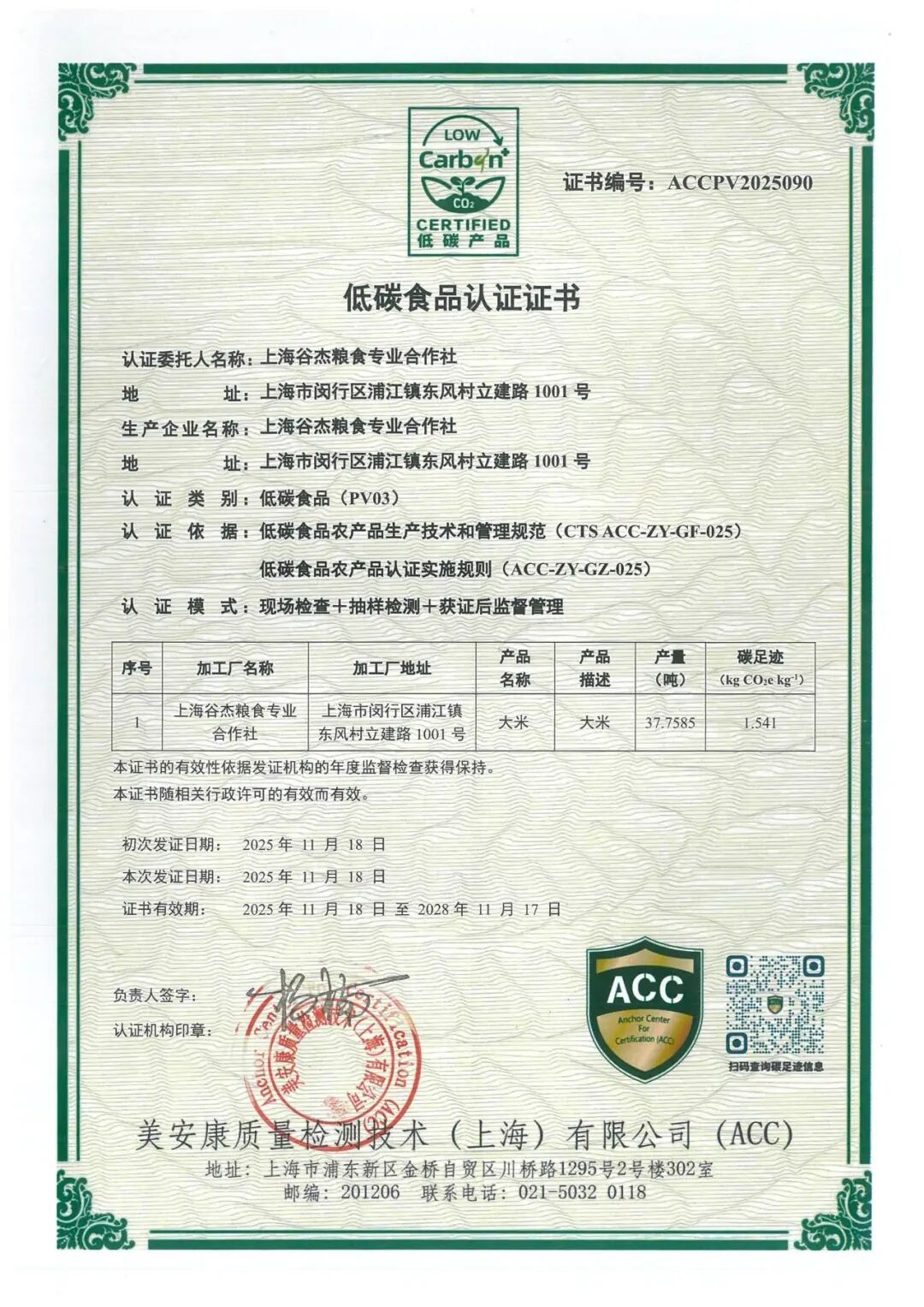 沪郊大米销售如火如荼,这几日,上海谷杰粮食专业合作社理事长郭杰正忙着给自家大米打上“低碳标签”。11月18日,谷杰合作社拿到了水稻“低碳农产品认证”和大米“低碳食品认证”双证书,这也是上海首次取得水稻领域的“碳标签”,标志着本市在探索农业低碳发展道路上迈出了关键一步。