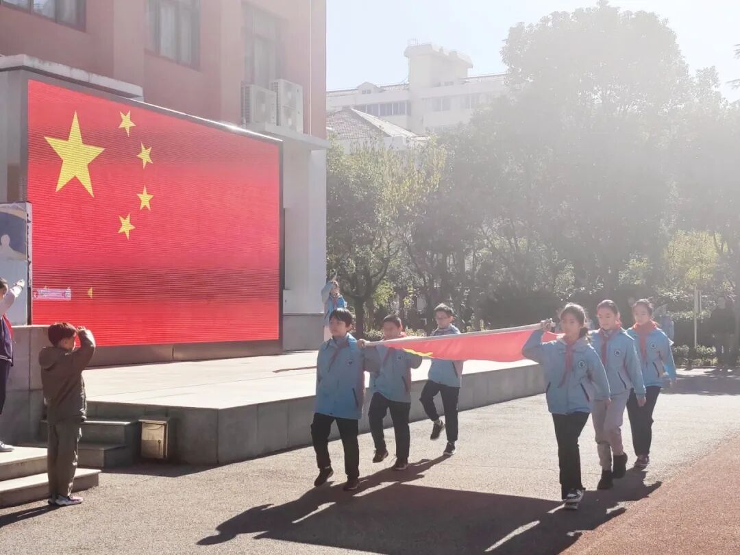 “齐步——走!”六名少先队员护旗手身着整洁校服,昂首挺胸,迈着整齐划一的步伐,神情庄重地护送着五星红旗。在激昂雄壮的《义勇军进行曲》中,鲜艳的五星红旗冉冉升起、迎风飘扬。全体师生肃立注目,目光追随着国旗缓缓上移,嘹亮的国歌声响彻校园。