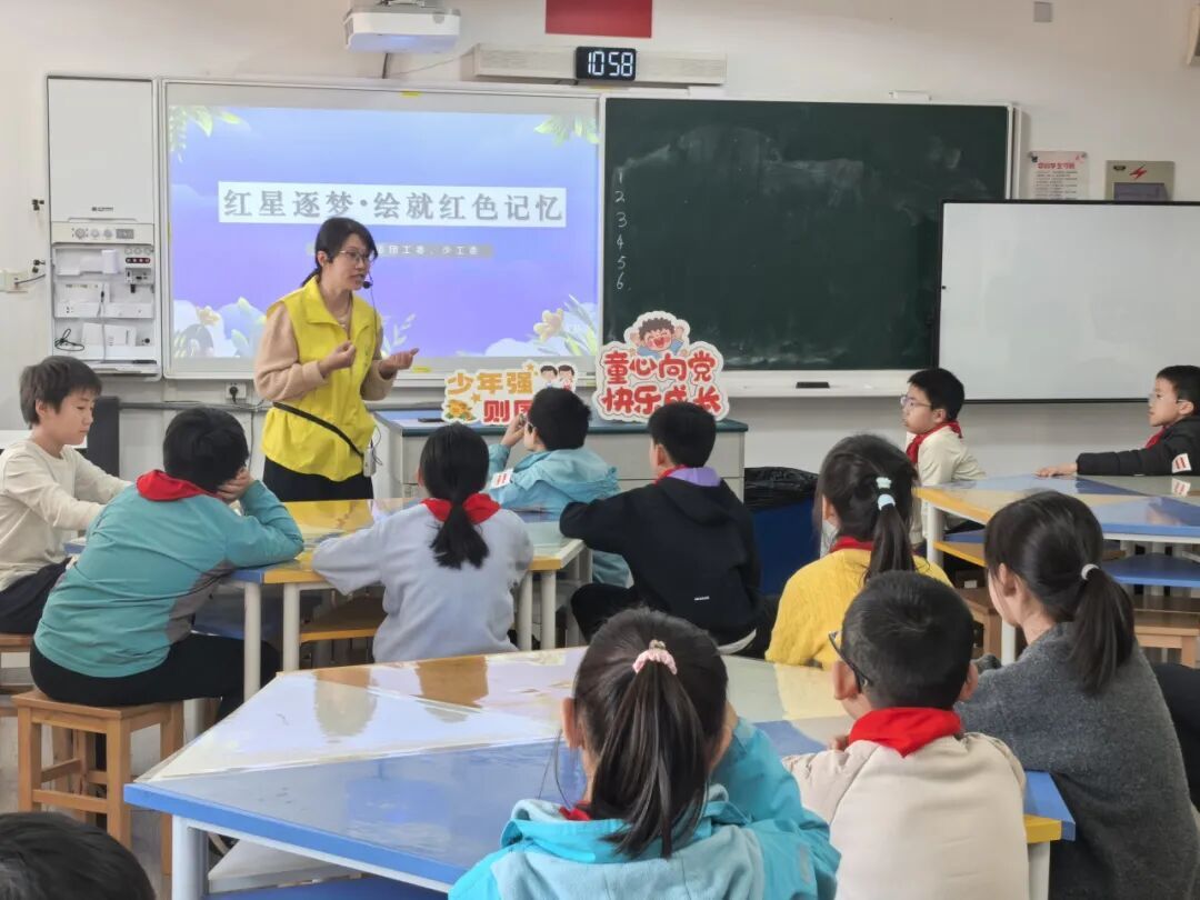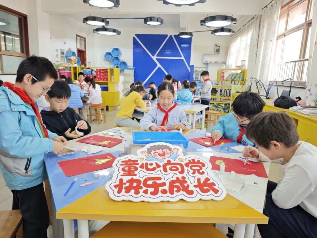 活动还设置了“红色爱国金箔画”创作体验环节,在专业老师的指导下,孩子们兴致勃勃地动手实践,只见他们小心翼翼地拿起薄如蝉翼的金箔,循着图案轮廓一片片粘贴——迎风招展的红旗、劈波斩浪的红船、熠熠生辉的五星……指尖轻拂间,不仅是对传统金箔技艺的亲身感知,更是借这一非遗载体,巧妙融入对革命岁月的讲述,让孩子们在一贴一拂间触摸历史的温度。