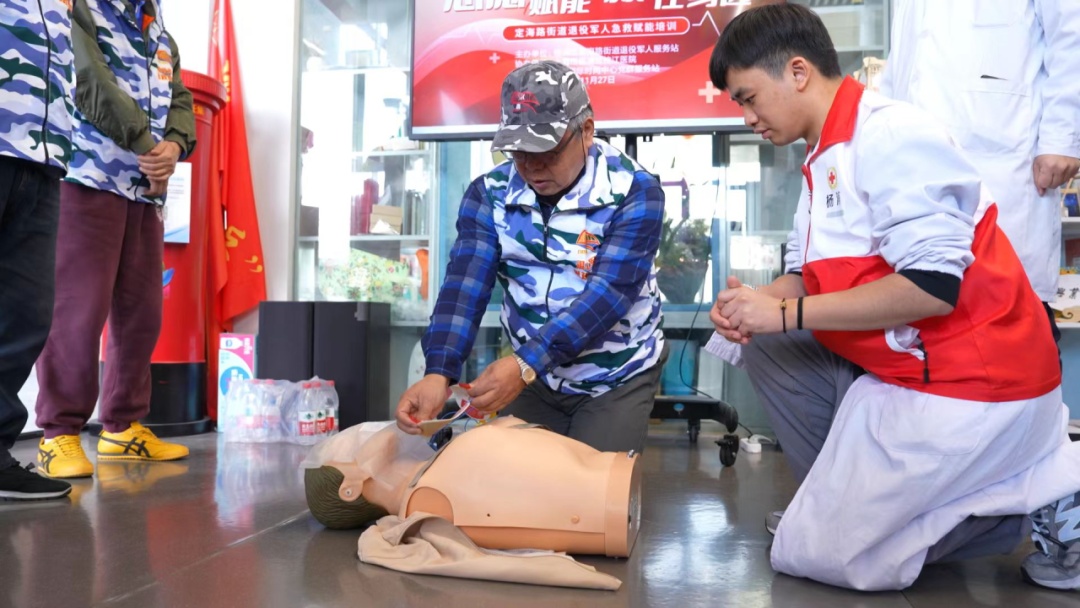 脱下军装,不褪本色。近日,在杨浦区定海路街道一场别开生面的急救培训现场,退役军人俯身练习心肺复苏,动作认真、节奏沉稳。“以前看到有人倒地,心里着急却不敢上手。现在学会了,关键时刻真能救命!”退役士兵冯伟平擦了擦额头的汗,语气坚定。