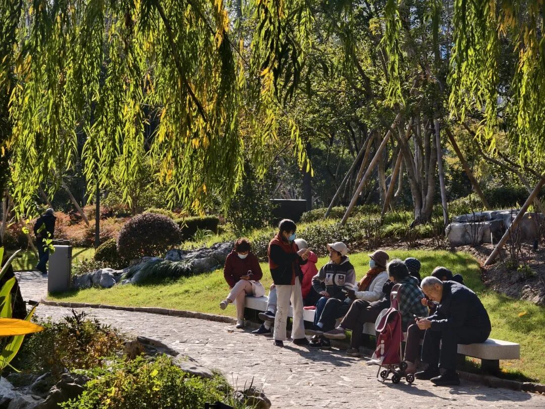 上午十点,阳光上岗,不少游客来到漕溪公园散步游玩。老年市民坐在公园长椅上晒着太阳唠家常,家长们则带着孩子在公园内游玩,一派悠闲的景象。