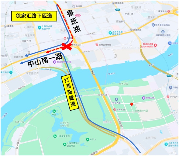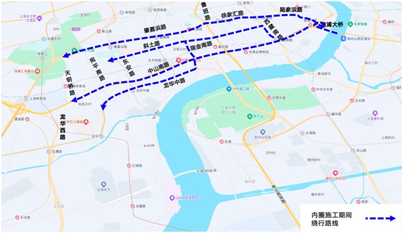 鲁班转盘往内环高架内圈匝道封闭期间,原途经车辆需往外圈西藏南路下匝道驶离高架,掉头后沿中山南一路继续行驶,或提前经南北高架西侧徐家汇路、打浦路隧道等周边道路绕行。