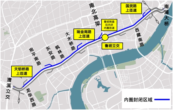 周一至周日夜间24时至次日晨6时内环高架(南浦大桥至龙华西路)内圈主线封闭,鲁班转盘往内环内圈匝道封闭。