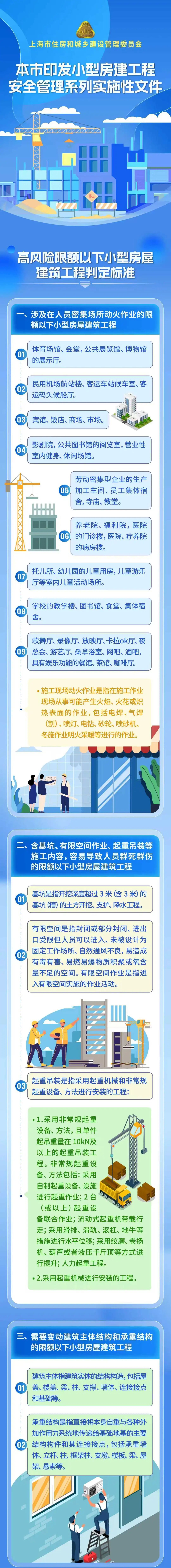 根据《上海市限额以下小型房屋建筑工程安全生产管理办法》(沪府办规〔2025〕12号)规定,市住房城乡建设管理委制定了《高风险限额以下小型房屋建筑工程判定标准》《业主、建设单位、施工单位管理职责清单和高风险限额以下小型房屋建筑工程管理要求》《街道办事处、乡镇人民政府巡查检查重点内容清单》等实施性文件,一起来看图解↓