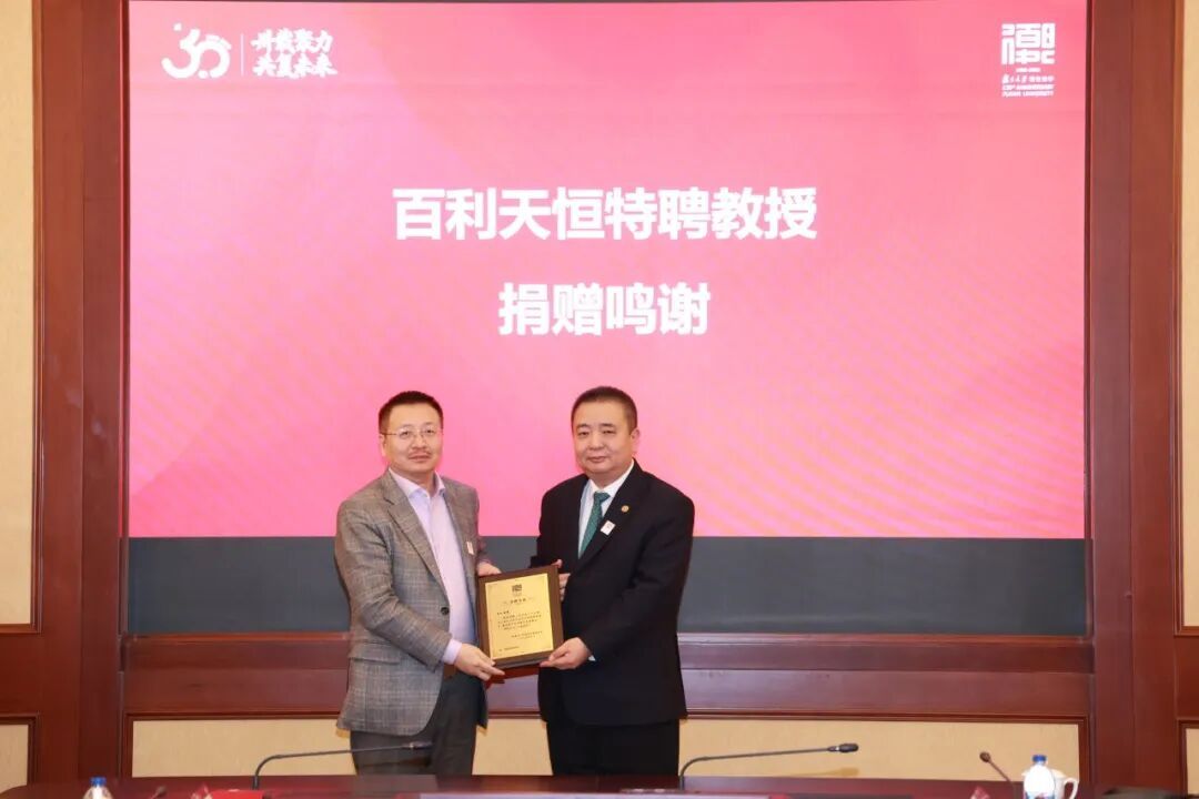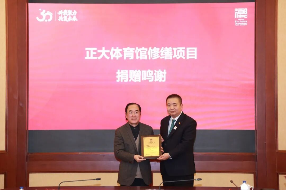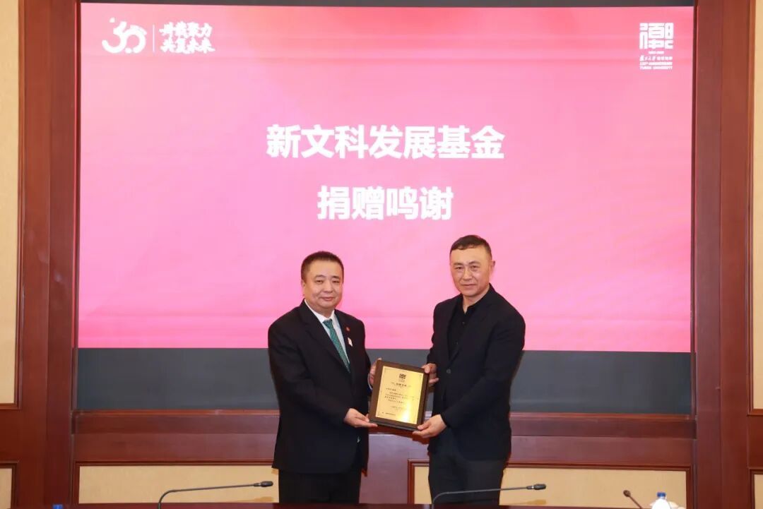 捐赠签约仪式现场,百廿之际由校董王长田及校董伉俪屠宁康、曹国伟联合捐赠设立的新文科发展基金完成实质落地签约。金力先后向李大鹏、谢吉人校董企业正大集团、蔡彤、袁蕙华、朱义、王长田、屠宁康、李多珠等校董或校董企业代表颁发捐赠鸣谢牌。