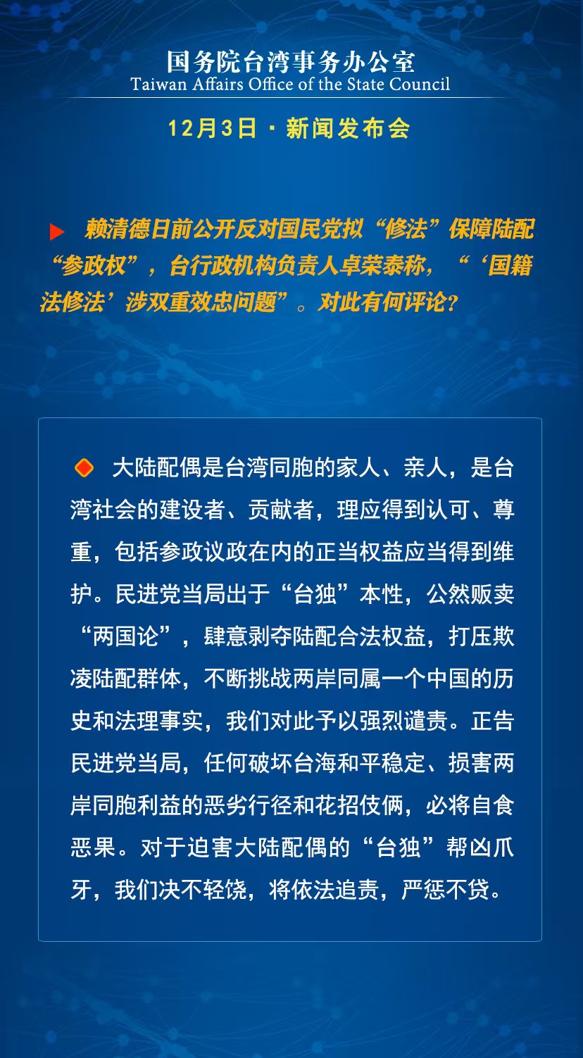 国台办:强烈谴责民进党当局打压欺凌陆配群体
