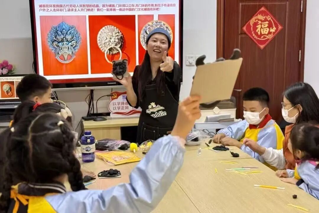 门环是家的讯号,更是岁月的印记。活动伊始,老师讲述了古代宫殿铺首衔环、江南民居如意纹样的故事,让孩子们在聆听中感受匠人心意与传统祝福。随后的创作环节,“小小匠人工坊”热闹非凡,揉、捏、压、刻,平凡黏土变身各具特色的门环,金色与黑色交织出古铜质感,彩色搭配彰显童真想象。