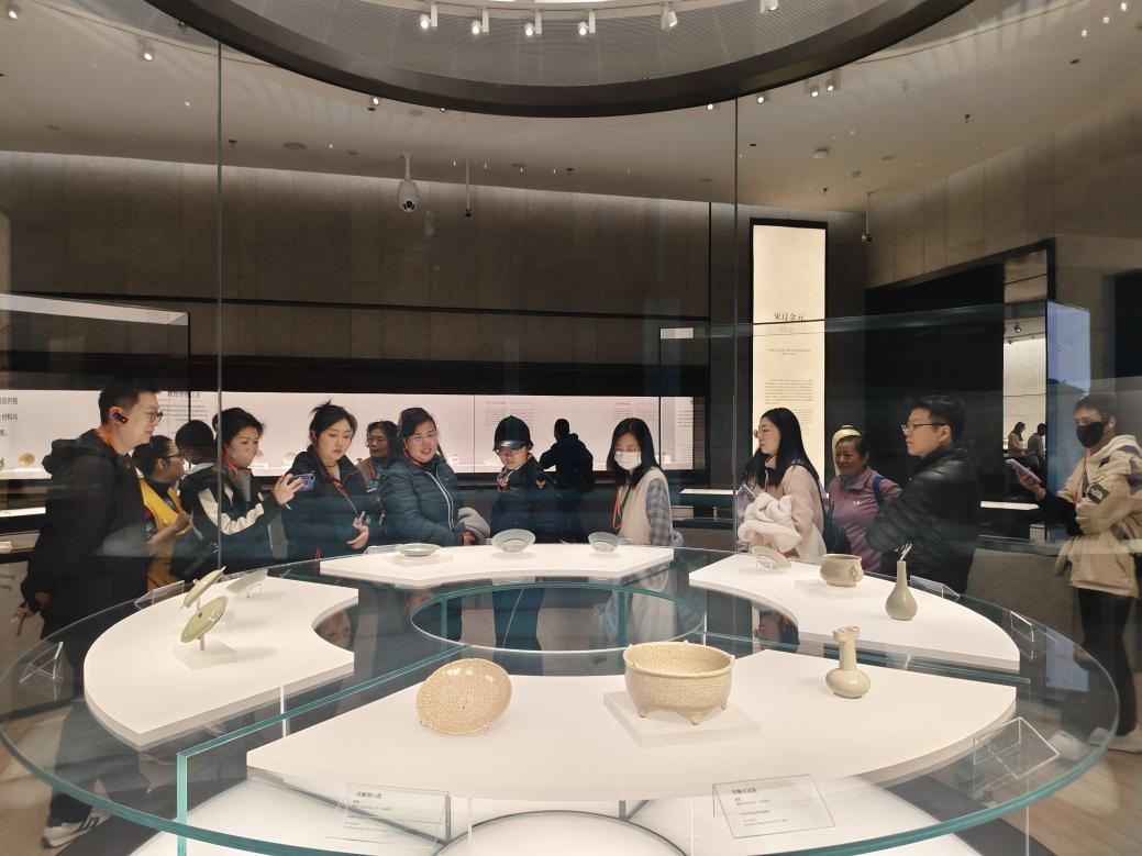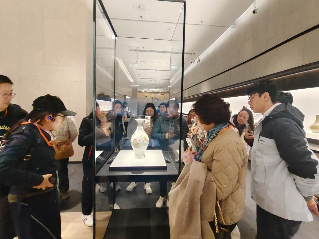 陶瓷馆内,一场跨越千年的审美之旅徐徐展开。宋代美学独树一帜,汝窑青釉盘以“天圆地方”的造型和温润如玉的釉色,诠释着“雨过天青云破处”的极致意境,将宋代“极简美学”的浪漫展现得淋漓尽致;秘色瓷莲花碗更是巧夺天工,薄如蝉翼的瓷身透光性极佳,碗身的莲花纹饰栩栩如生,尽显唐代越窑的高超水准。从唐代的雄浑大气,到宋代的雅致内敛,再到明清粉彩的绚丽多姿,一件件陶瓷珍品串联起华夏审美变迁的脉络,让参与者深刻体会到陶瓷艺术背后的文化传承。
