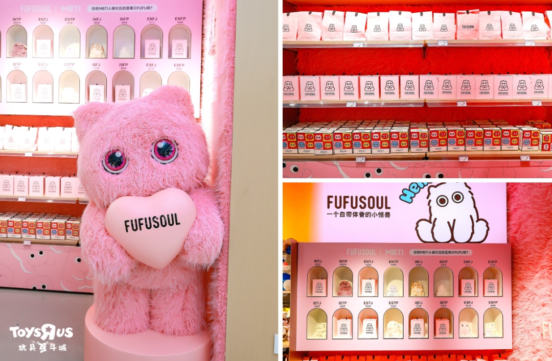 FUFUSOUL也于此打造了品牌特装店,构建了一个融合香氛嗅觉与毛绒艺术的治愈空间。独特的MBTI人格叙事化陈列,将自带体香的小怪兽们对应16型人格,邀请玩家探索“你的MBTI是哪只FUFU”,开启一场充满共鸣的寻香之旅。店内更设打卡墙,半人高粉红小怪兽在粉色毛绒墙前静候粉丝合影。整个开放式区域被柔软毛绒包裹,与专属香氛交织,共同营造出一场唤醒视觉、触觉与嗅觉的多维感官的治愈之旅。