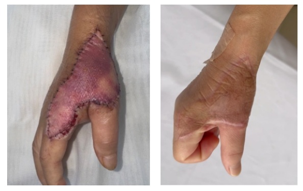 术后第5天拆除负压装置时,皮片已呈现健康粉红色,血运良好;6周随访,王女士手部活动自如,虎口开合正常,抓握有力,外观几乎看不出手术痕迹。“以前连拿筷子都费劲,现在能自己做饭、抱孙子了。”她的变化,正是这项技术最有力的注脚。更重要的是,整个过程仅需一次手术,避免了反复住院和高昂费用,真正实现了“高效、安全、经济”的修复目标。