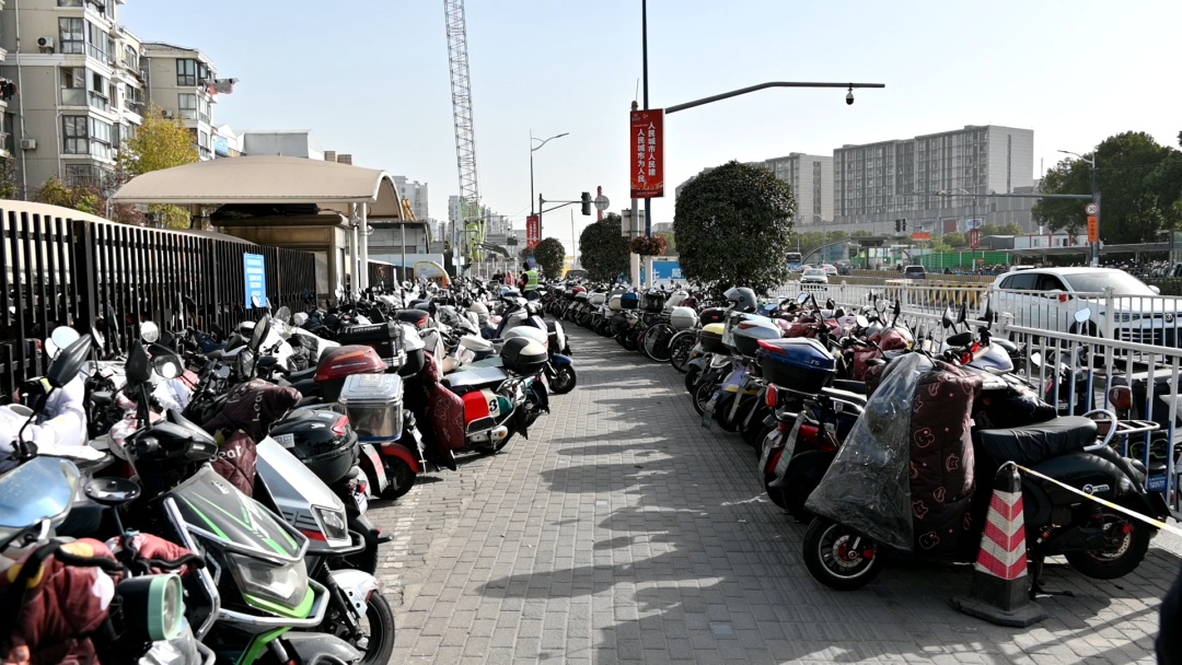早上8点半,记者在轨交金运路站看到,电瓶车停放区内车辆一辆挨着一辆,从站点出入口一路延伸至站外百余米。由网格员组成的“护车队”沿着一排排车逐一查看,及时取下车主遗留的车钥匙,并手机拍照留存。