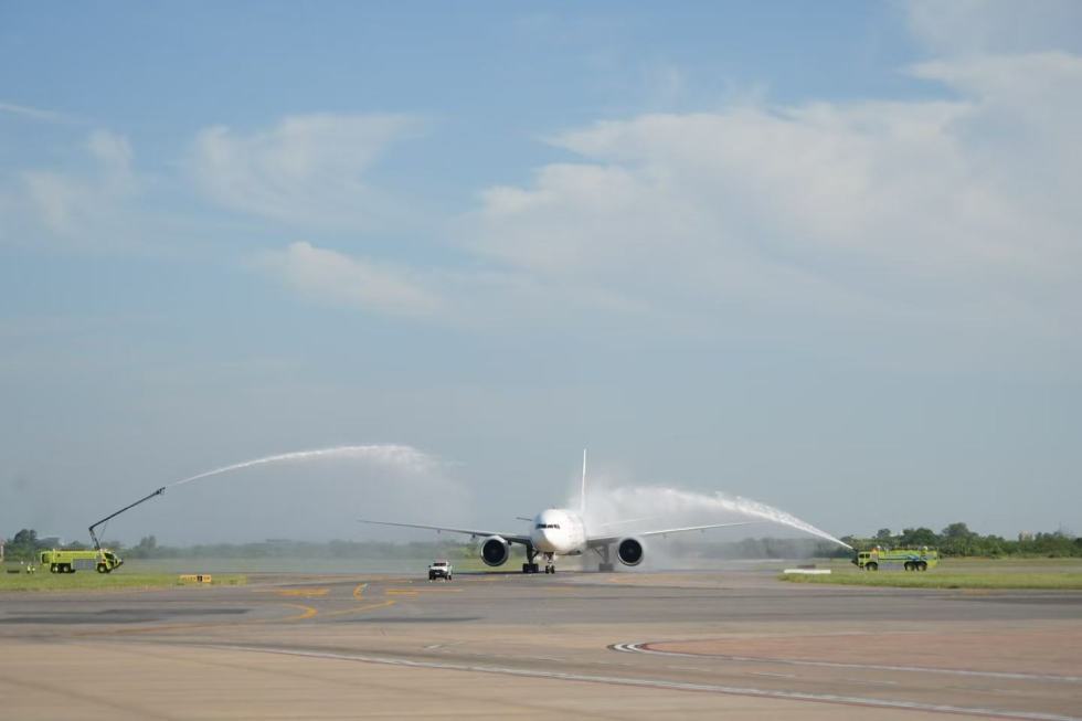 当地时间12月4日16:44,东航MU745航班平稳降落在阿根廷首都布宜诺斯艾利斯埃塞萨国际机场,当地以象征国际民航最高礼仪的“水门仪式”为远道而来的旅客和机组人员“接风洗尘”。