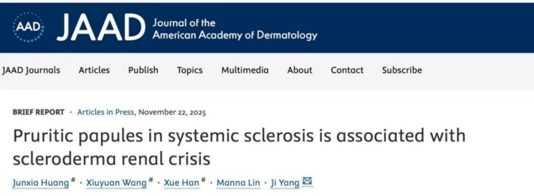 近日,复旦大学附属中山医院皮肤科杨骥教授团队在美国皮肤病学会杂志《Journal Of The American Academy Of Dermatology》 在线发表题为“系统性硬化症患者的瘙痒性丘疹与硬皮病肾危象相关”的研究论文。研究团队基于长期大量临床患者的分析、对比、随访和总结,首次揭示了一种特征性皮疹可成为系统性硬化症肾危象的早期预警信号。借助这一发现实现疾病的早诊早治,能有效提高这类患者的生存率。