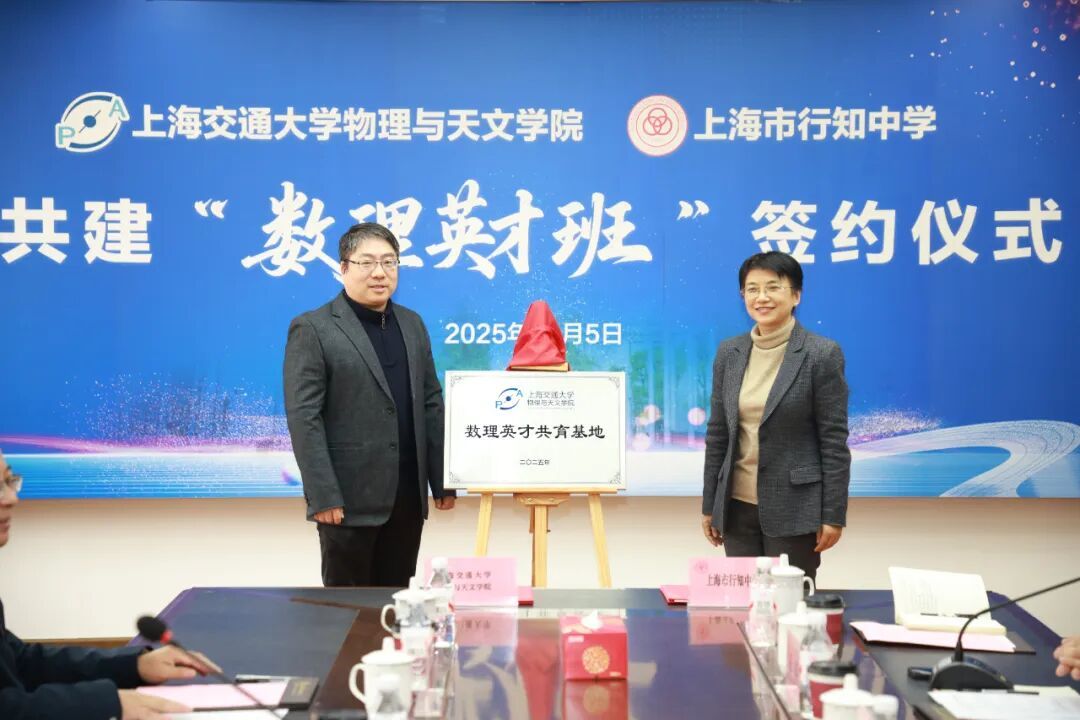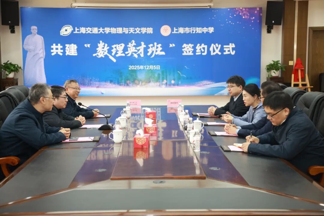 12月5日,上海市行知中学与上海交通大学物理与天文学院正式签约,共同启动“数理英才班”。 签约仪式前,宝山区教育工作党委书记黄琼(右三)与上海交大、行知中学相关领导座谈 宝山区教育工作党委书记黄琼表示,此次上海交通大学物理与天文学院与行知中学强强合作,是宝山教育主动对接高水平大学、探索人才培养新路径的里程碑事件。希望“行知-交大物理与天文学院”“数理英才班”的合作模式能够成为宝山教育对外开放合作、深化综合改革的典范,为探索中国特色、上海特点、宝山特色的现代化教育发展路径提供宝贵的经验,为上海教育事业的改革发展贡献宝山智慧。 双方重点围绕数学和物理学科,携手探索“高中-大学”一体化拔尖创新人才培养模式。 这远不止于增设一个班级,而是直面一个核心教育命题:如何为那些在基础科学领域初显天赋与热忱的少年,铺设一条从高中到大学无缝衔接、能持续点燃其内在潜能的成长通道?