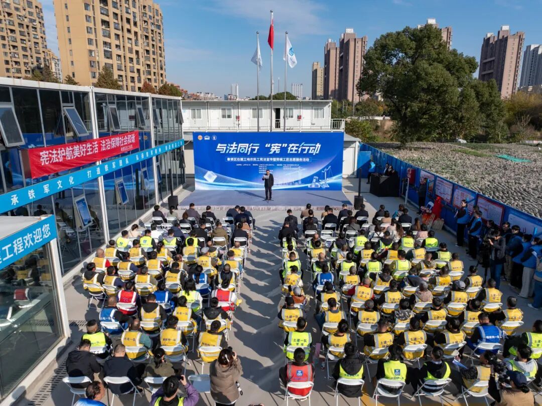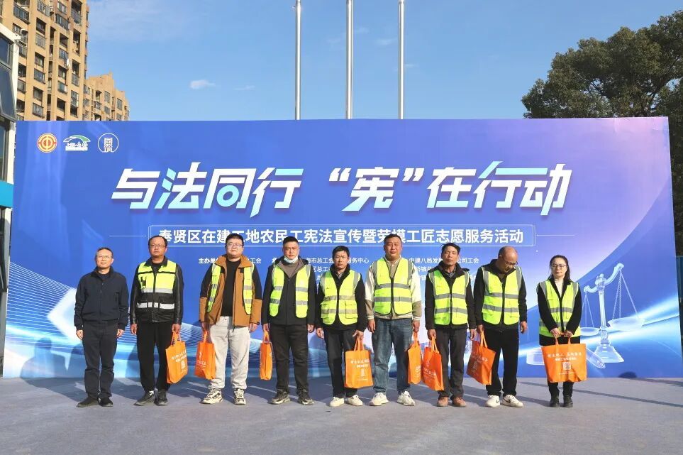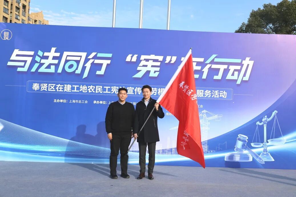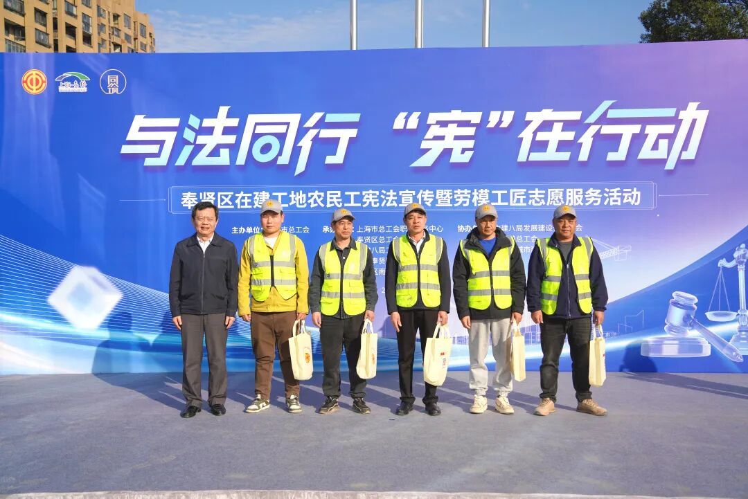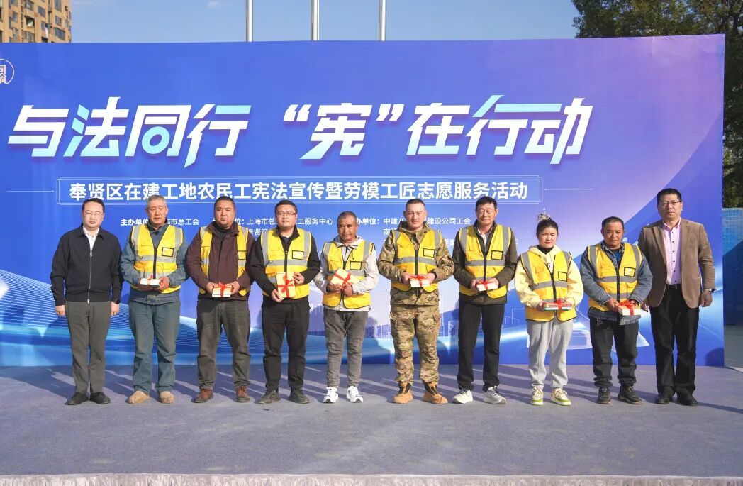 今年12月4日是第十二个国家宪法日,12月1日至7日是上海市第三十七届宪法宣传周。为进一步弘扬宪法精神,助力构建和谐稳定的劳动关系,营造尊法、学法、守法、用法的浓厚氛围,12月4日下午,由上海市总工会主办的“与法同行‘宪’在行动”——奉贤区在建工地农民工宪法宣传暨劳模工匠志愿服务活动在奉贤新城九华路初中新建工程项目开展。