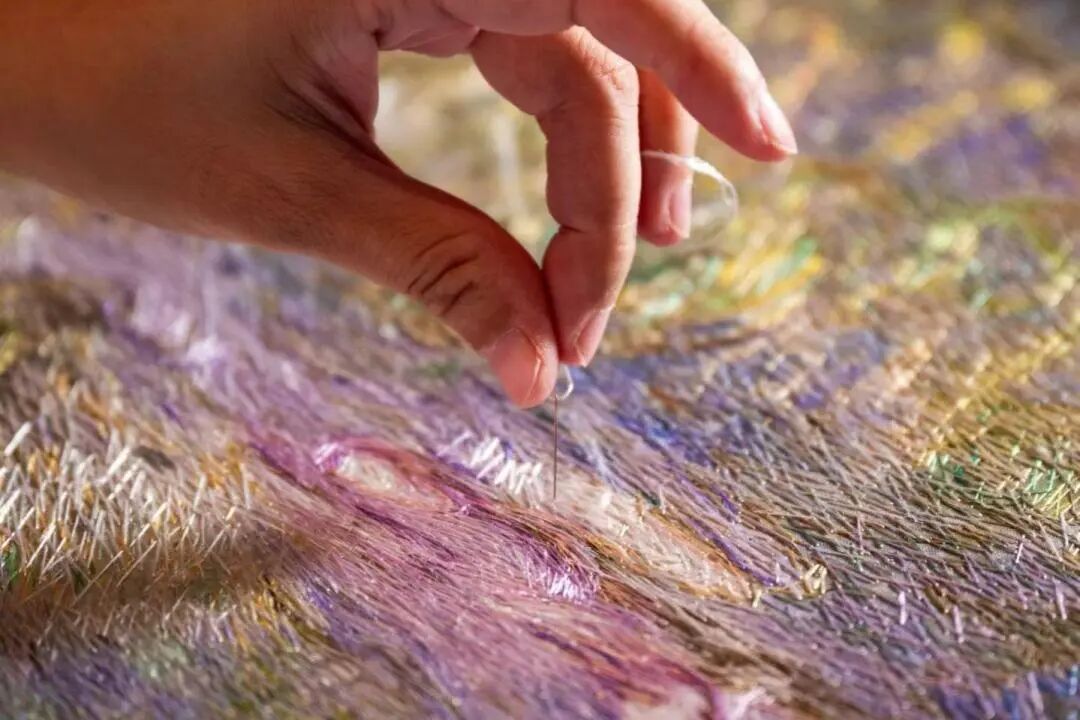 嘉定苏绣技法源于传统苏绣,保留了苏绣的传统工艺,改革开放后,受到嘉定籍画家陆俨少绘画的影响,渐渐形成独有的水墨风格:用刺绣模拟出水墨的质感,呈现笔断意连的效果,以达到绣出不是画作,胜比画作的作品。