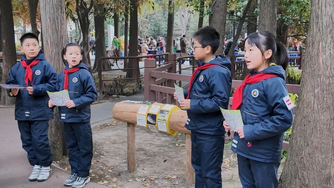 “我身后的这个湖叫‘海上第一泉’,里面生活着多种不同的鱼类。”“湖的周围还种植了不同的中药材,比如半夏、枸杞、银杏等。”由小小志愿者担任的生态讲解员,带领居民依次探访了“海上第一泉”生态治理区、白洋亭观鸟点、啾扑滩生物多样性区和生境花园功能示范区,用童真而专业的语言介绍人工湖治理成果、鸟类栖息习性、昆虫旅馆功能等生态知识。
