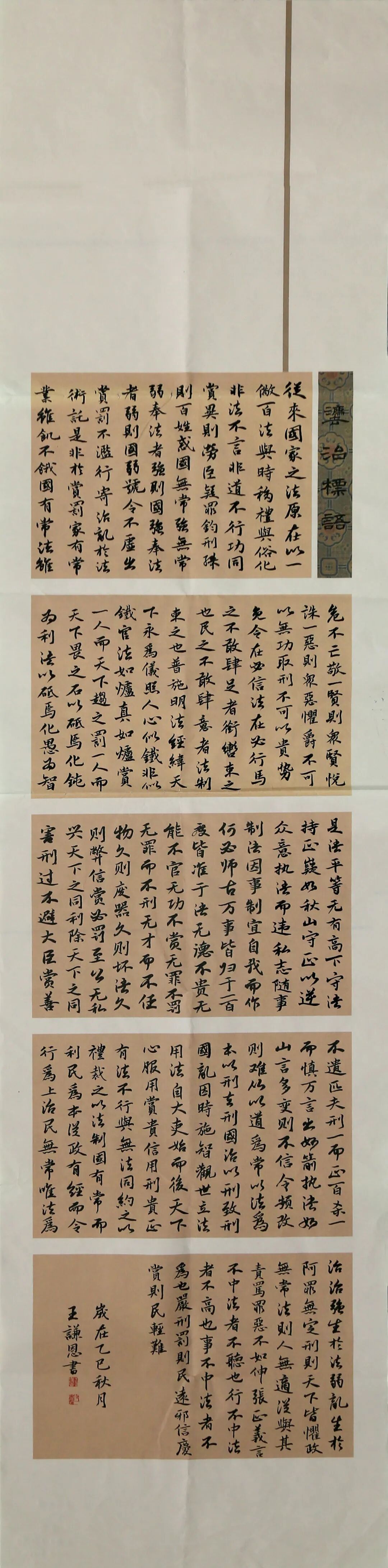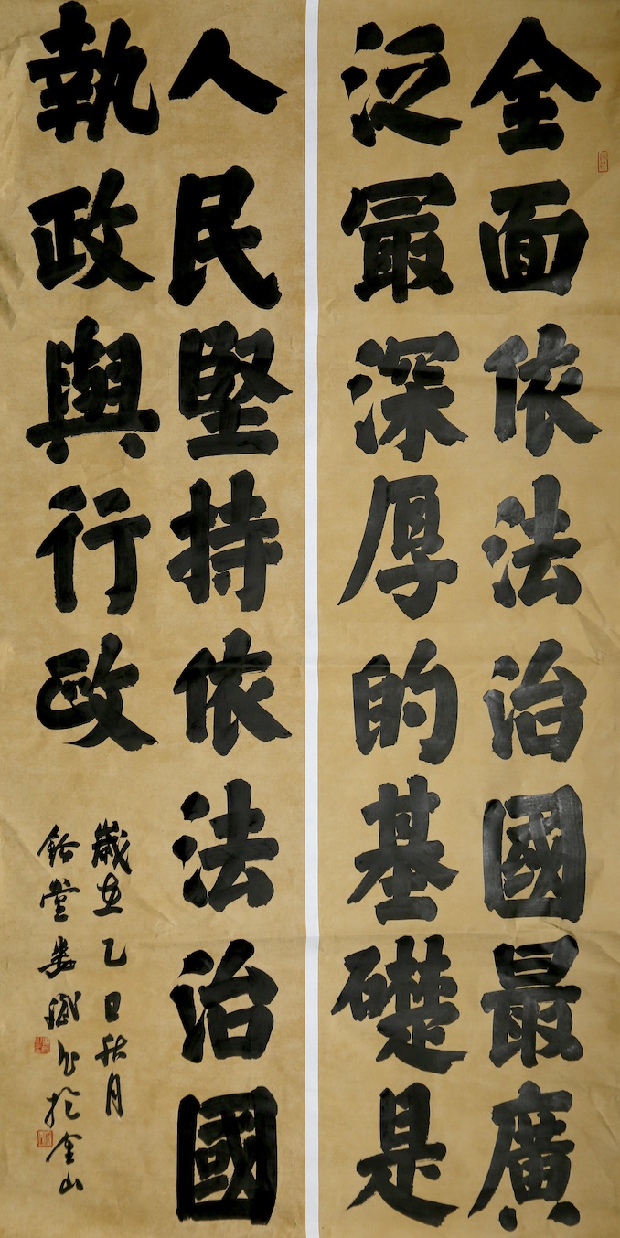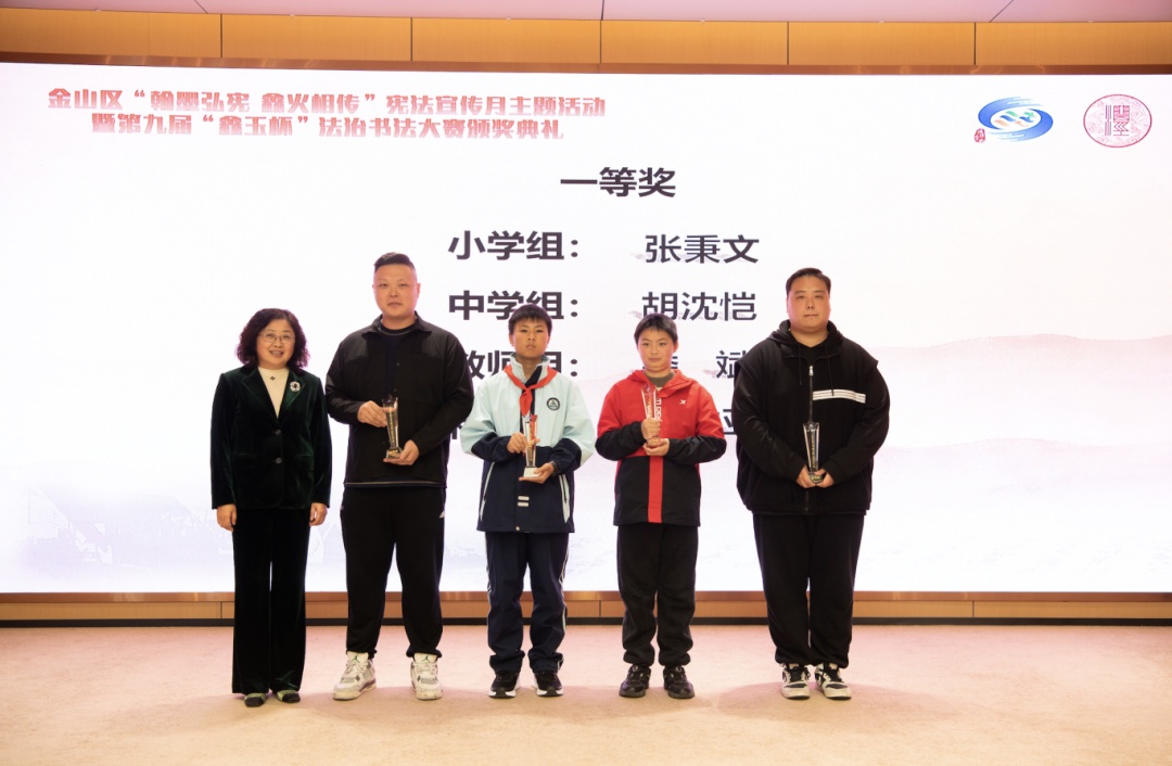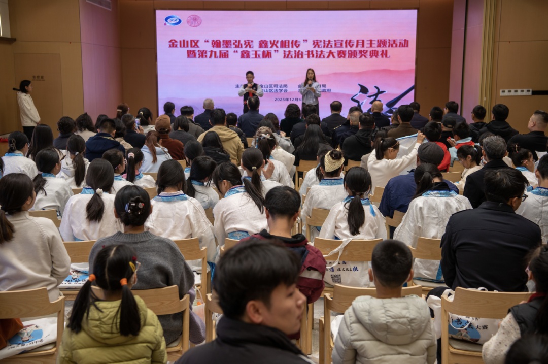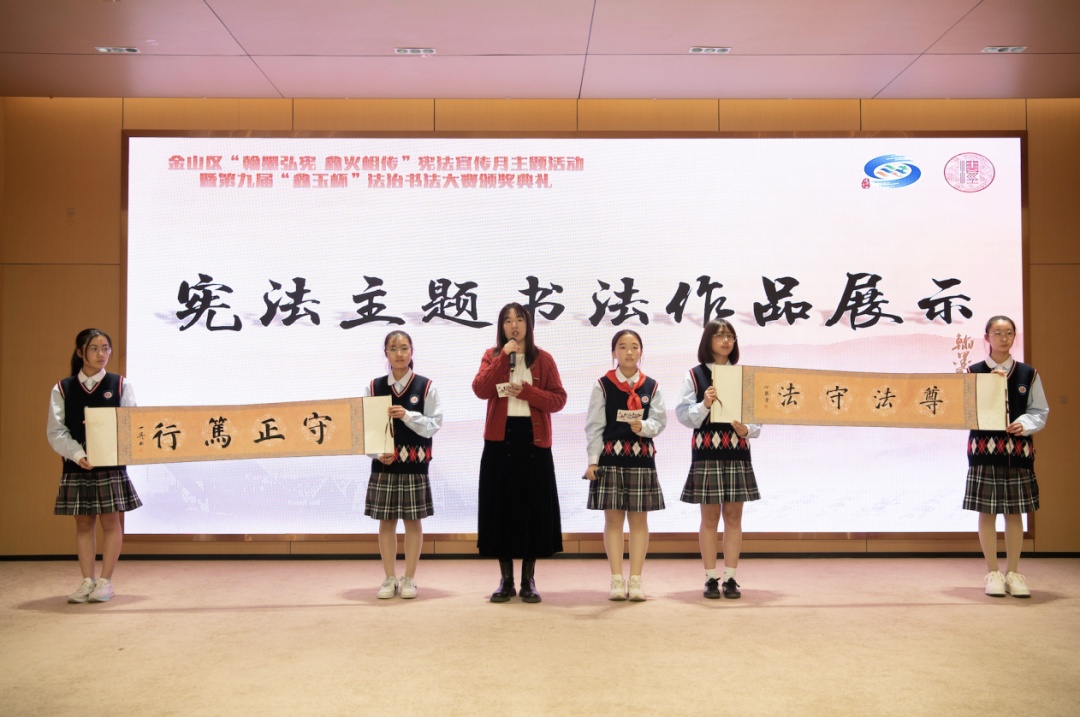 活动现场发布了《漕泾镇书法人文教育五年规划(2026年—2030年)》,进行了宪法主题书法作品展示,并为金山区第九届“鑫玉杯”法治书法大赛获奖代表进行颁奖。为了让法治教育入心入脑,现场还以“书”弘“法”,在室外草坪上开展了一场书法写作展示活动,吸引了不少懂宪法、爱书法的青少年参与。