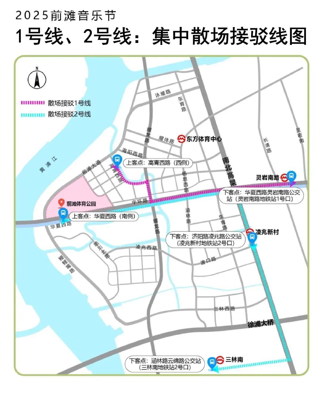 上海前滩音乐节今天开幕,搭乘地铁如何通行?出行攻略看过来! 地铁指南 公共交通 可乘地铁6/8/11号线至东方体育中心站,转乘接驳车或步行2公里前往前滩体育公园。 定时定点免费接驳车 / 进场及提前离场接驳车 / 运营时间:12:00-19:00 >>接驳线路:杨思西路耀体路公交站上下客点(东方体育中心地铁站3号口)➡️东育路杨思西路公交站上下客点➡️高青西路上下客点(近梁月路,去往演出场地3/5/6号口)➡️华夏西路下客点(去往演出场地2/9号口)➡️华夏西路上客点(南侧辅道,公园9号门对面)➡️杨思西路耀体路公交站上下客点(东方体育中心地铁站3号口),循环接驳。 >>乘车建议: 自东方体育中心地铁站及周边停车场前往演出场地的观众,可至杨思西路耀体路公交站乘车;自前滩世贸中心(前滩企业天地)、前滩国际广场停车场前往演出场地的观众,可至东育路杨思西路公交站乘车。