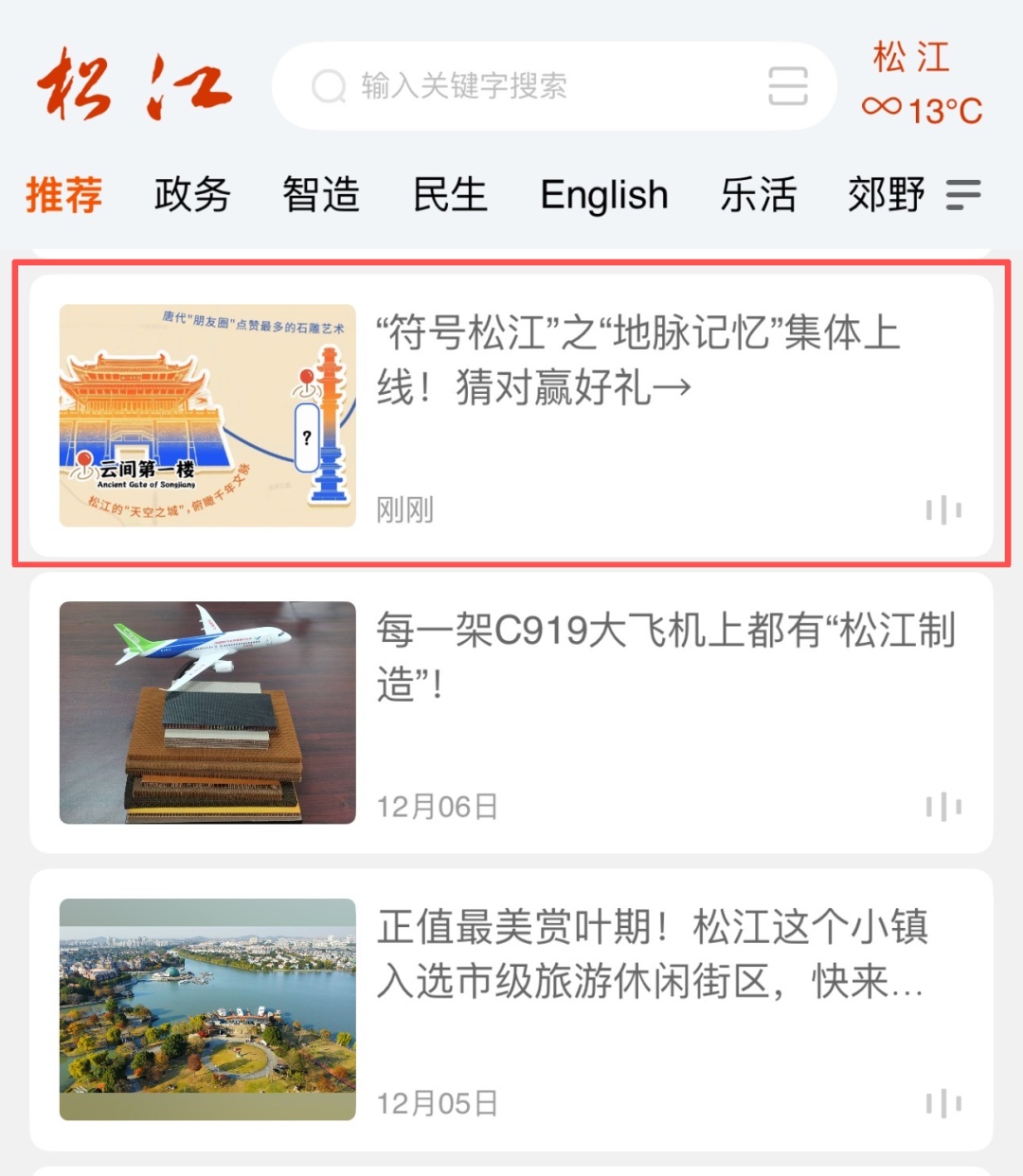 3.在客户端首页“推荐”栏目进入活动文章(见下图),在留言区回复“符号1名称+符号2名称+符号3名称”,前10名同时猜对3个符号的粉丝,将获得“符号松江”专属定制文创!
