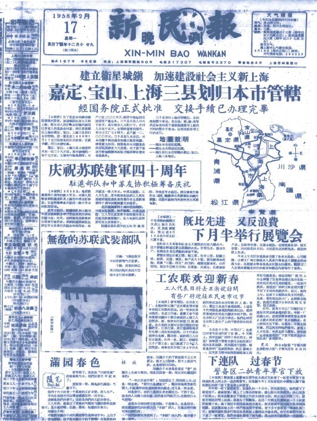 1958年2月17日,《新民报》晚刊刊登上海县划归上海市管辖的报道