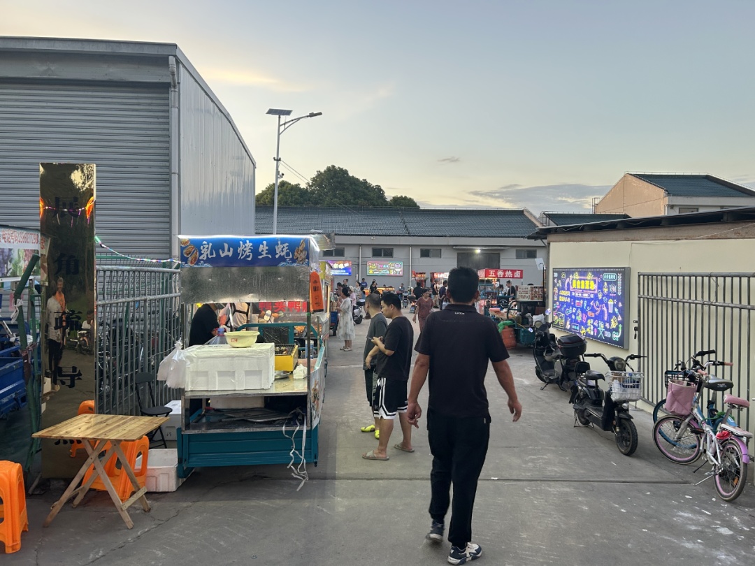 每晚七点未到,环城西路与灯北路交界处的乡村夜晚便提前苏醒。彩灯渐次亮起,烧饼、臭豆腐、烧烤、卤味、米粉等各色小吃摊有序排列,围出一片香气四溢的美食夜市。食物的热气与香味迅速吸引了周边市民,没一会儿,摊位前就聚拢了不少熟客。