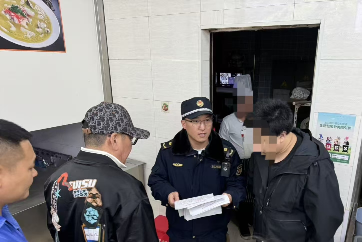 “唰~唰~”后厨里,执法人员一页页翻动着台账,一场针对餐厨废弃油脂的联合检查正在进行。和以往不同,这次是“组团”上门——宝山路街道综合行政执法队联合区废弃物管理所、收运企业各司其职,查得细、讲得透。