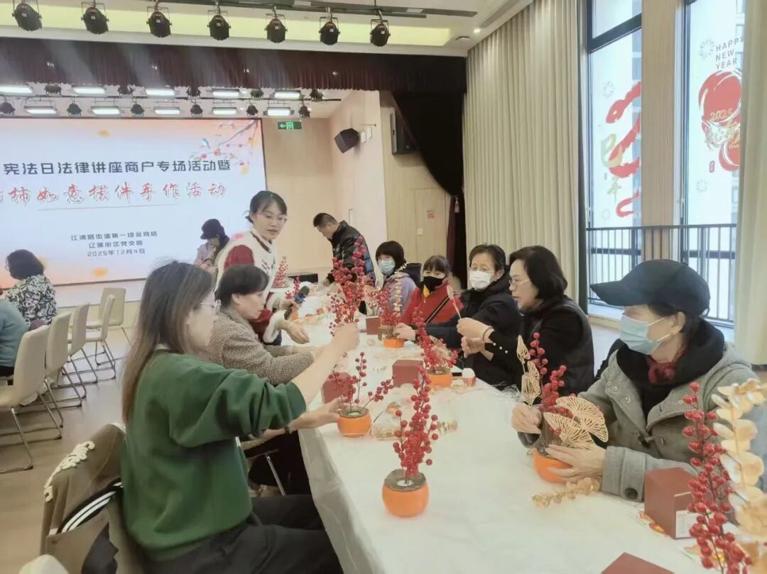 为推动宪法深入人心,近日,江浦路街道第一综合网格联合司法所、街区党支部,为沿街商户举办了一场别开生面的主题活动,将专业普法与创意手作相结合,不仅让商户们在轻松氛围中学法、知法、懂法、用法,更送上了“柿柿如意”的美好祝福,