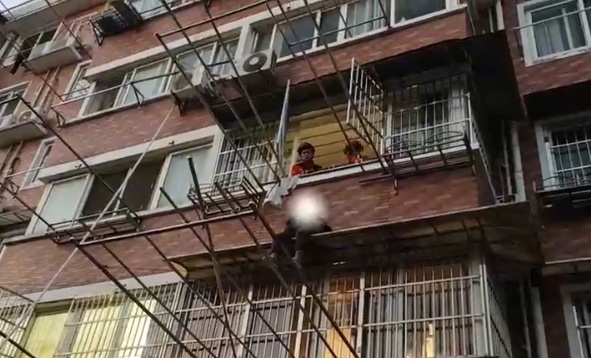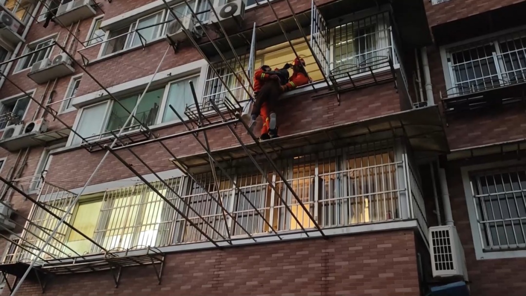 消防救援人员抵达现场后了解到,这名老人患有阿尔茨海默病,自行从三楼阳台攀爬至二楼住户的雨棚上,随时面临坠落危险。救援人员当即组织一楼住户用棉被等物品搭建防护缓冲,同时安排一名救援人员穿戴好防护装备,从三楼窗户爬出至雨棚处,迅速用安全绳和腰带将老人稳妥固定。
