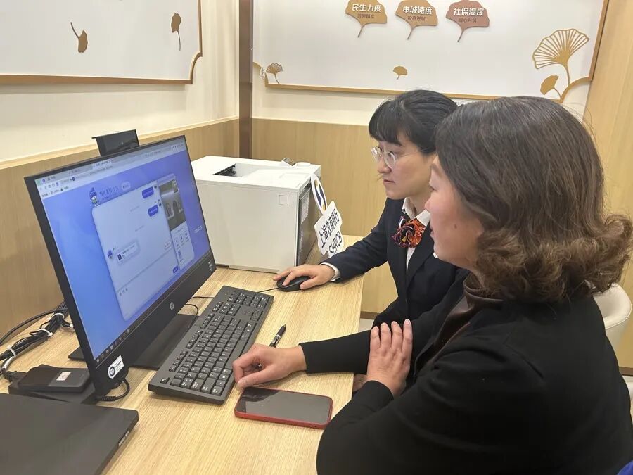 图为工作人员正在帮龚丹连线社保中心的服务人员。/王嘉旖摄