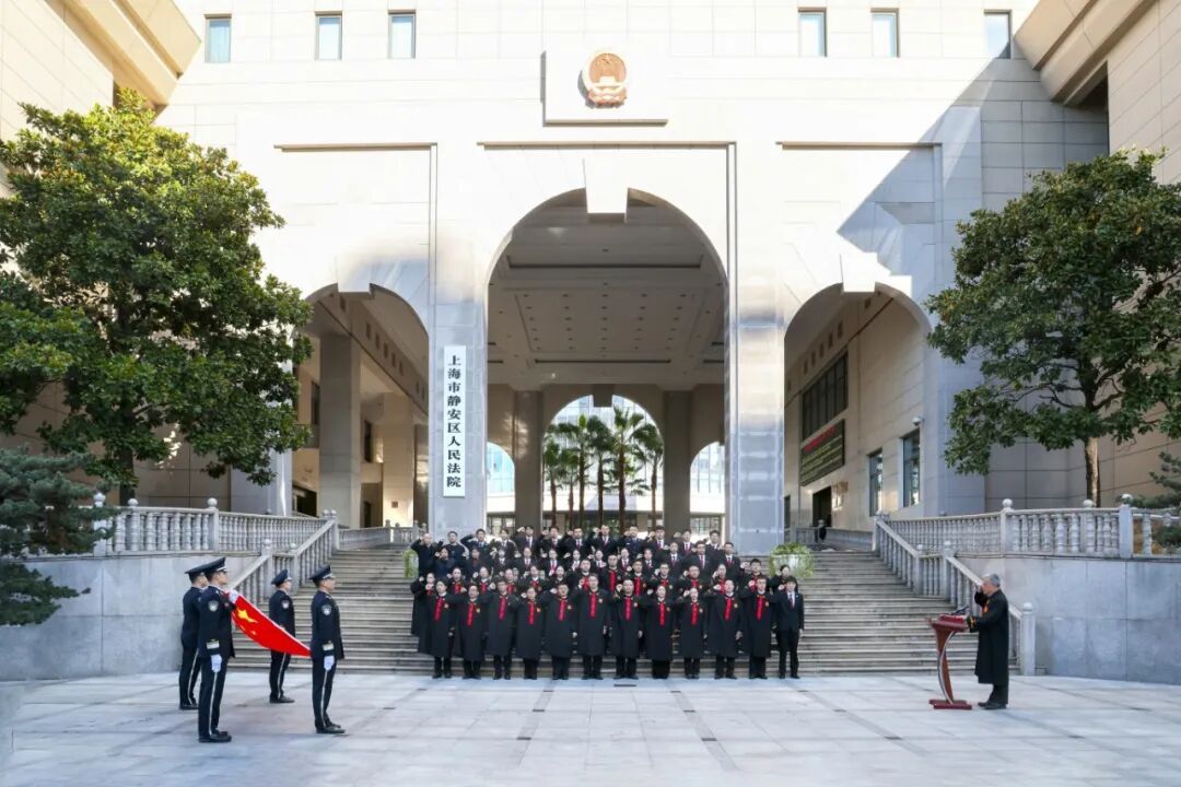 在静安法院举行的宪法宣誓活动中,新提任中层干部、新入额法官、新进公务员、新任命人民陪审员代表等50余人进行宪法宣誓。干警们面向中华人民共和国国旗,整装肃立,高举右拳,其他宣誓人员列队站立,跟诵誓词。