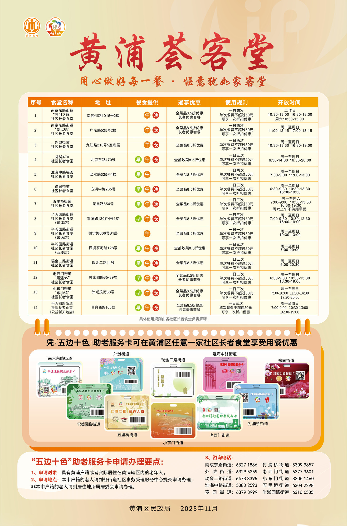 据悉,“黄浦荟客堂”品牌标识已经在全区14家社区长者食堂统一悬挂,各食堂还都设置了统一的信息看板,详细公示每周菜单、服务监测等级、运营时间等信息,让服务更加透明化,管理更加规范化,切实提升长者的就餐体验与满意度。