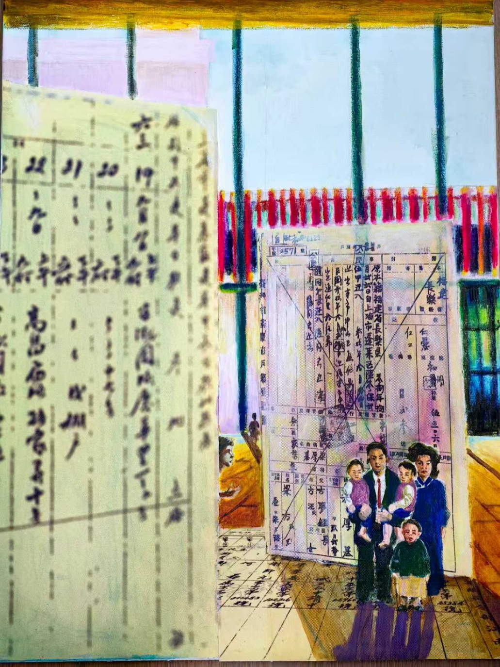以这次经历为题,我画了这张画。右侧是台北的《户口名簿》,祖父祖母,抱着叔叔姑姑还有父亲,一家人就站在这份档案前。这是我们家族在台北的“根”与“据”。